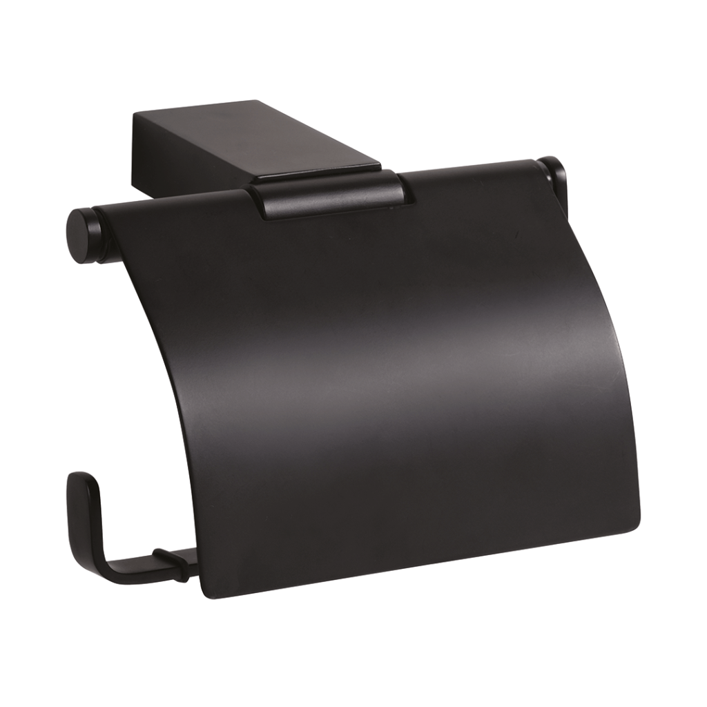 Elegantní a nadčasové koupelnové nástěnné doplňky z prvotřídní mosazi v moderní černé barvě od dodavatele Bemeta, série Nero. Praktický nástěnný držák toaletního papíru s krytem.