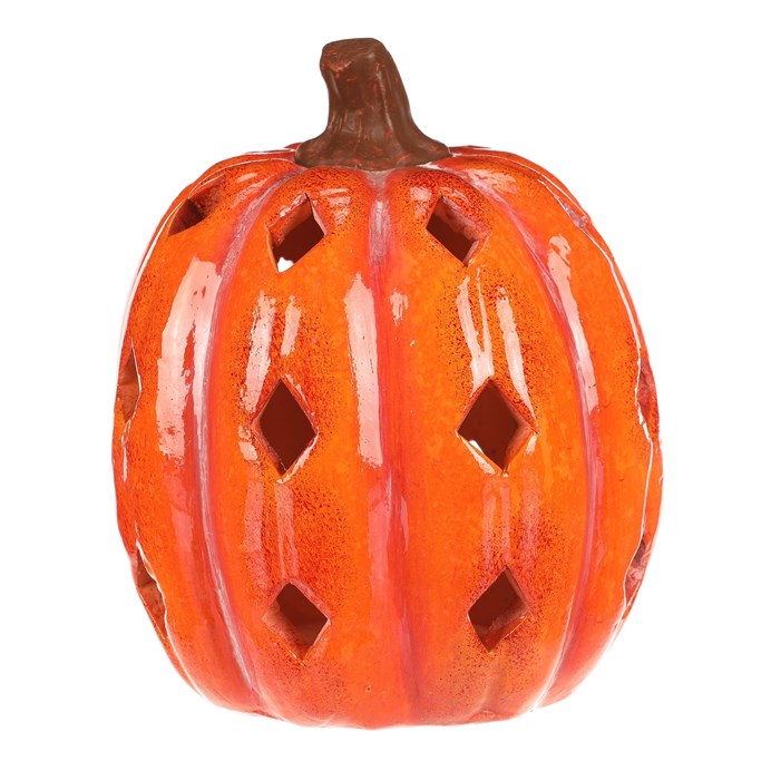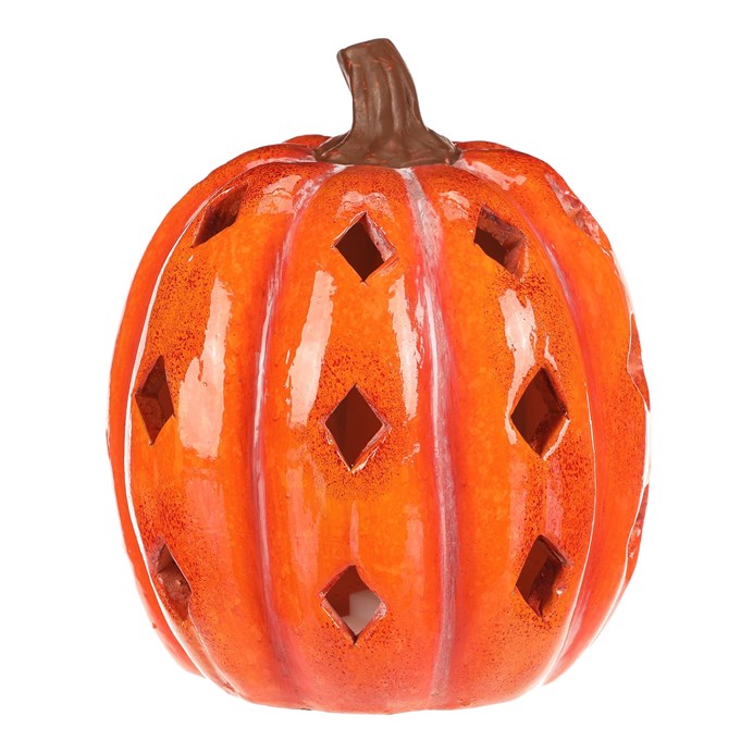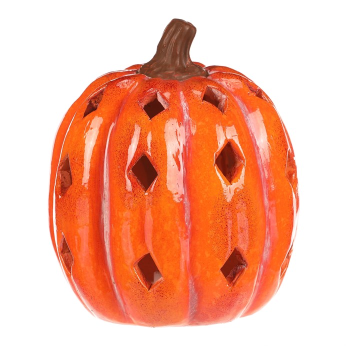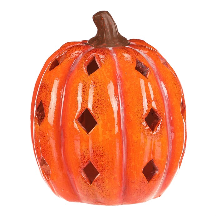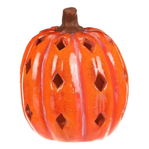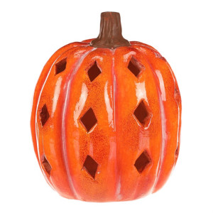 Dotaz na produktOranžová dýně z keramiky s lesklým povrchem a prostorem, ve kterém je umístěné LED osvětlení, navodí tu pravou podzimní atmosféru. Po obvodu se nachází hranaté otvory v prizích, kterými budou po rozsvícení umělé svíce efektně procházet paprsky světla.