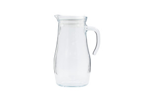 Skleněný džbán s plastovým víčkem a skleněnou rukojetí pro lepší úchop.