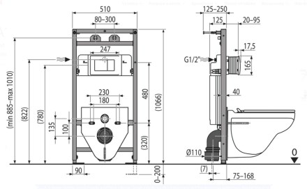 šířka 510 mmhloubka 160-200 mmstavební hloubka 125 mm (s odpadním kolenem 160 mm)montážní hloubka 20-95 mmvýška 1067 mmpřipojení G1/2"objem vody v nádržce 9 lvelké spláchnutí 6-9 lmalé spláchnutí...