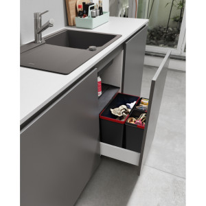 Dotaz na produkt Na splátky ještě dnesMin. montážní prostor 414 × 378 × 343 mm. Barva černá. 3 Koše (1× 14,5 l, 2× 7,5 l). Výška košů 324 mm. Police nad košem v ceně koše. Koš se vkládá do zásuvky s plnovýsuvem, která je osazena podélným relingem nebo vysokou bočnicí. Doporučené plnovýsuvy BLUM, GRASS, HETTICH. Systém EASYSORT umožňuje pohodlné třídění odpadu. Koše pro třídění odpadu jsou vyrobeny z recyklovaného antiseptického materiálu, který snižuje výskyt bakterií až o 99%.