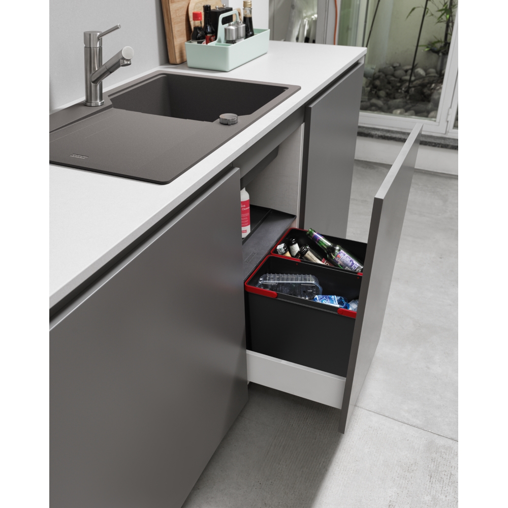 Dotaz na produkt Na splátky ještě dnesMin. montážní prostor 414 × 378 × 343 mm. Barva černá. 2 Koše (2× 14,5 l). Výška košů 324 mm. Police nad košem v ceně koše. Koš se vkládá do zásuvky s plnovýsuvem, která je osazena podélným relingem nebo vysokou bočnicí. Doporučené plnovýsuvy BLUM, GRASS, HETTICH. Systém EASYSORT umožňuje pohodlné třídění odpadu. Koše pro třídění odpadu jsou vyrobeny z recyklovaného antiseptického materiálu, který snižuje výskyt bakterií až o 99%.