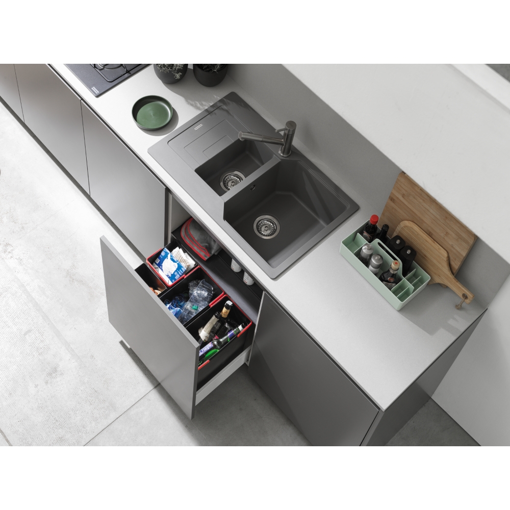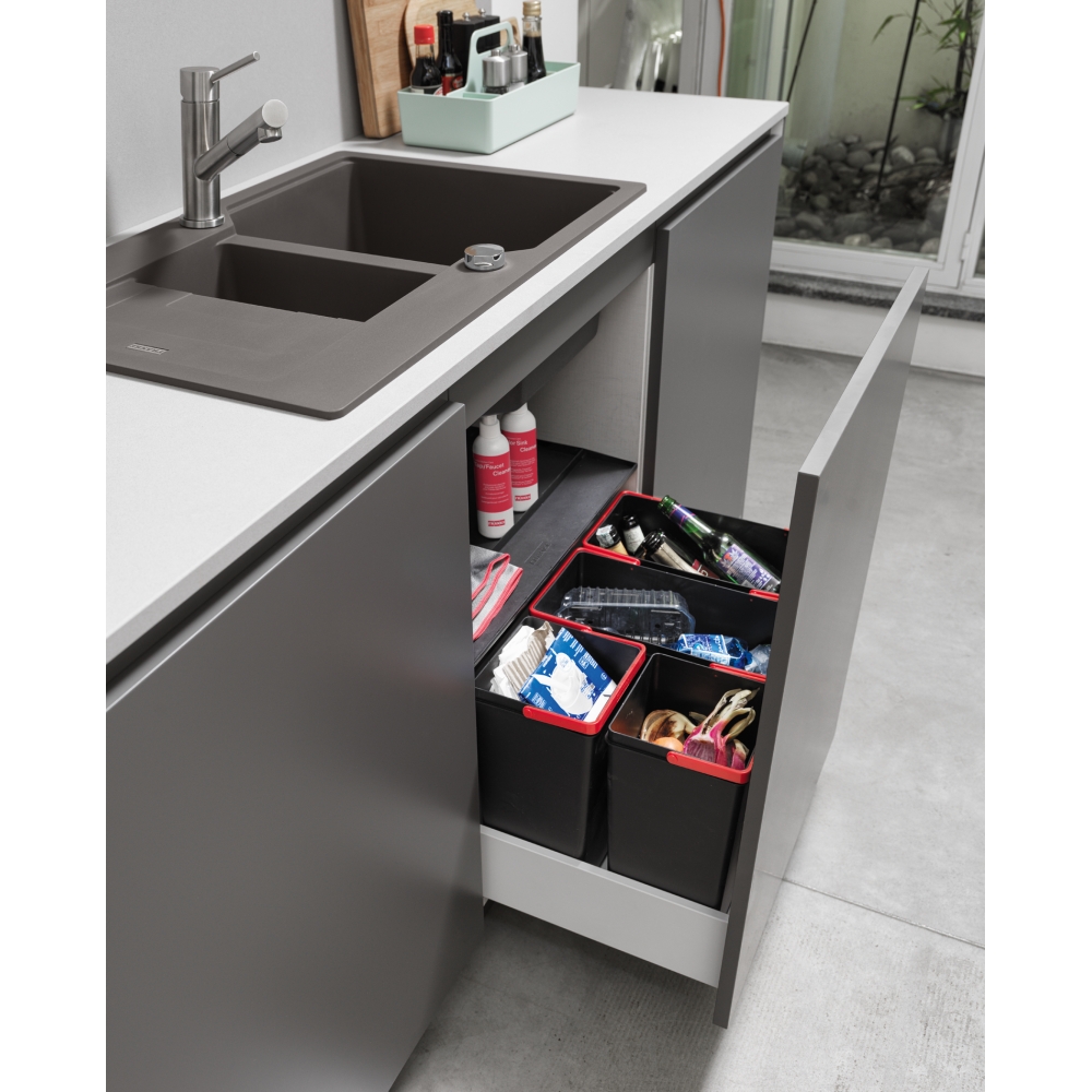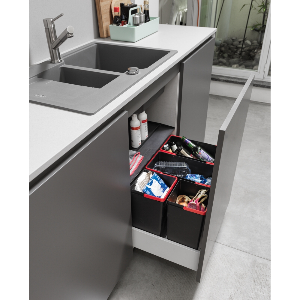 Dotaz na produkt Na splátky ještě dnesMin. montážní prostor 564 × 378 × 343 mm. Barva černá. 4 Koše (2× 14,5 l, 2× 7,5 l). Výška košů 324 mm. Police nad košem v ceně koše. Koš se vkládá do zásuvky s plnovýsuvem, která je osazena podélným relingem nebo vysokou bočnicí. Doporučené plnovýsuvy BLUM, GRASS, HETTICH. Systém EASYSORT umožňuje pohodlné třídění odpadu. Koše pro třídění odpadu jsou vyrobeny z recyklovaného antiseptického materiálu, který snižuje výskyt bakterií až o 99%.