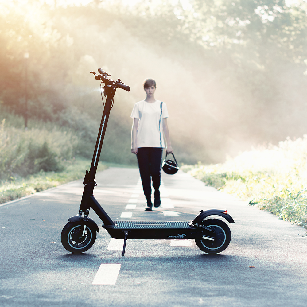 Díky jednoduchému systému složení, se během okamžiku změní na kompaktního společníka. Maximální rychlost koloběžky je 35 km/h, která se dá korigovat čtyřmi rychlostními módy. Samozřejmostí je i bezpečná jízda, o kterou se postarají kotoučové brzdy, kvalitní osvětlení s vysokým dosahem a protiskluzové rukojeti, díky kterým se stanou i delší trasy naprosto pohodlnými.