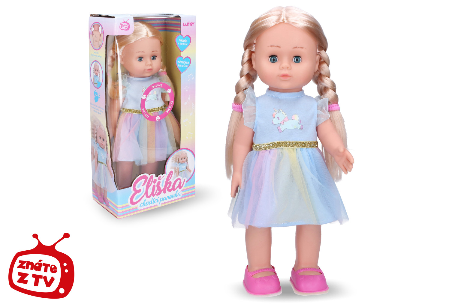 Dotaz na produktZačni den se svou nejlepší kamarádkou Eliškou. Eliška také ráda chodí a tančí. Vezmeš ji na procházku? Panenku Elišku si zamiluješ! Čeká vás spousta hraní a zábavy! Eliška je chodící panenka, která mooc ráda zpívá! Chceš si s ní zazpívat? Umí 7 lidových písniček. Stačí tlesknout a přidej se! Travička zelená Kočka leze dírou Červený šátečku Prší prší Já do lesa nepojedu Holka modrooká Kalamajka Velikost: 41 cm Doporučený věk: od 3 let Panenku je možno spustit ve dvou režimech (Try me/ON). V režimu Try me jen zpívá, nechodí. Přepínání na zádech. Baterie: 3x AA