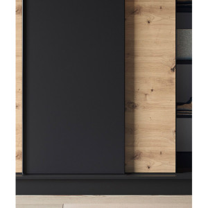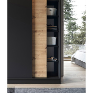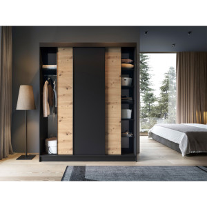Dotaz na produkt Na splátky ještě dnesŠatní skříň Esville s posuvnými dveřmi o hloubce 60 cm, šířce 180 cm a výšce 220 cm, dostupná v barvě artisan dub/matná černá, představuje praktické a elegantní úložné řešení. Díky své robustní konstrukci a pečlivému řemeslnému zpracování se stane ideálním doplňkem vašeho interiéru. Skříň je navržena s ohledem na optimální využití prostoru. Vnitřní prostor je vybaven 6 policemi, z nichž každá unese až 10 kg, což umožňuje uspořádané uložení různých předmětů. Součástí dodávky jsou také tyče, které umožňují zavěšení oblečení, což dále usnadňuje organizaci. Skříň je vyrobena z 16 mm silné MDF desky a představuje pevnou konstrukci s ABS hranami, které ji chrání před poškozením a dodávají celkové kompozici eleganci. Nohy vysoké 0,5 cm, vyrobené z odolného syntetického materiálu s černou povrchovou úpravou, zajišťují stabilní umístění a snadnou manévrovatelnost. Skříň Esville nabízí troje posuvné dveře, které umožňují pohodlné otevírání a zavírání, aniž by zabíraly další prostor. Díky tomuto designu je ideální volbou i do menších prostor. Barevné provedení skříně v tónech artisan dub a matná černá jí dodává moderní vzhled, který se dobře hodí k různým stylům interiéru. Kromě toho je zde možnost vybrat si mezi verzí se zrcadlem a bez zrcadla, což umožňuje přizpůsobení vašim preferencím. Stručně řečeno, šatní skříň Esville s posuvnými dveřmi v rozměrech hloubky 60 cm, šířky 180 cm a výšky 220 cm je funkční a stylový kus nábytku, který vám poskytne praktický úložný prostor a zároveň dodá vašemu interiéru eleganci a estetiku.Látky: Dąb Artisan, Czarny Mat