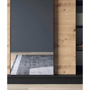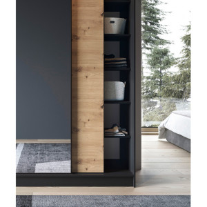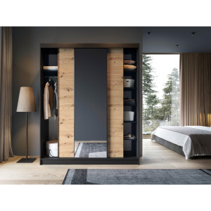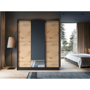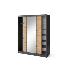 Dotaz na produkt Na splátky ještě dnesŠatní skříň Esville s posuvnými dveřmi a zrcadlem, o hloubce 60 cm, šířce 180 cm a výšce 220 cm, dostupná v barvě dub řemeslník/matná černá, představuje praktické a elegantní úložné řešení. Díky své robustní konstrukci a pečlivému řemeslnému zpracování se stane ideálním doplňkem vašeho interiéru. Skříň je navržena s ohledem na optimální využití prostoru. Vnitřní prostor je vybaven 6 policemi, z nichž každá unese až 10 kg, což umožňuje uspořádané uložení různých předmětů. Součástí dodávky jsou také tyče, které umožňují zavěšení oblečení, což dále usnadňuje organizaci. Skříň je vyrobena z 16 mm silné MDF desky a představuje pevnou konstrukci s ABS hranami, které ji chrání před poškozením a dodávají celkové kompozici eleganci. Nohy vysoké 0,5 cm, vyrobené z odolného syntetického materiálu s černou povrchovou úpravou, zajišťují stabilní umístění a snadnou manévrovatelnost. Šatní skříň Esville se zrcadlem nabízí troje posuvné dveře, které umožňují pohodlné otevírání a zavírání, aniž by zabíraly další prostor. Díky tomuto designu je ideální volbou i do menších prostor. Barevné provedení šatní skříně v odstínech dubového dřeva a matné černé jí dodává moderní vzhled, který dobře ladí s různými styly interiéru. Stručně řečeno, šatní skříň Esville s posuvnými dveřmi a zrcadlem, o rozměrech hloubky 60 cm, šířky 180 cm a výšky 220 cm, je funkční a stylový kus nábytku, který vám poskytne praktický úložný prostor a zároveň dodá vašemu interiéru eleganci, optickou lehkost a estetiku. Materiál: Dąb Artisan, Czarny Mat