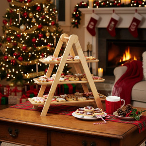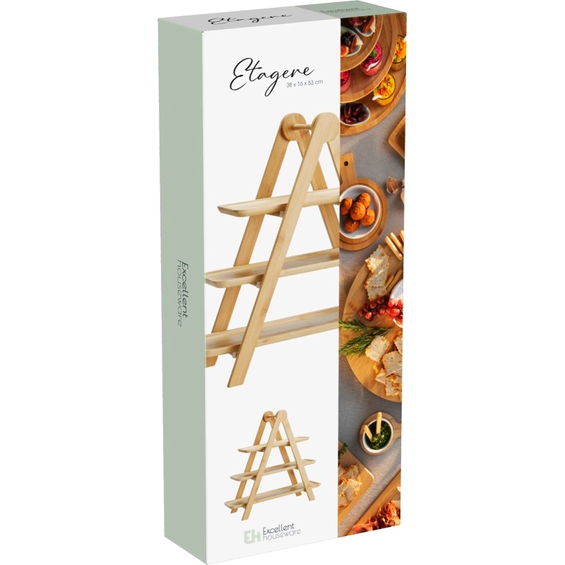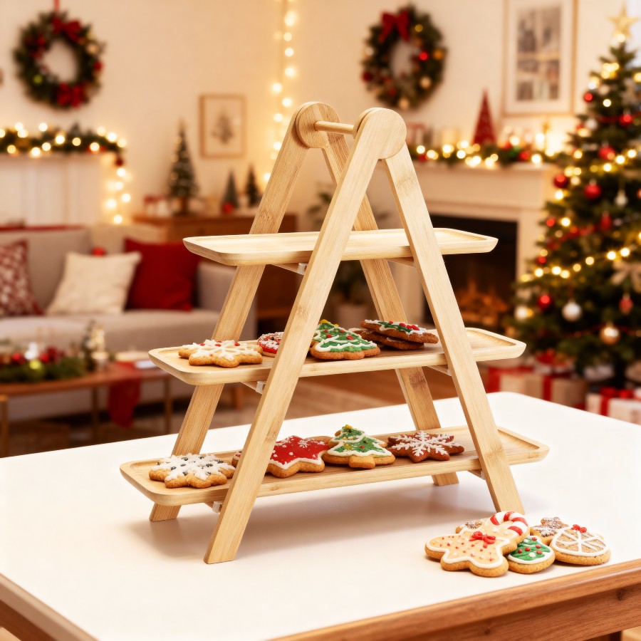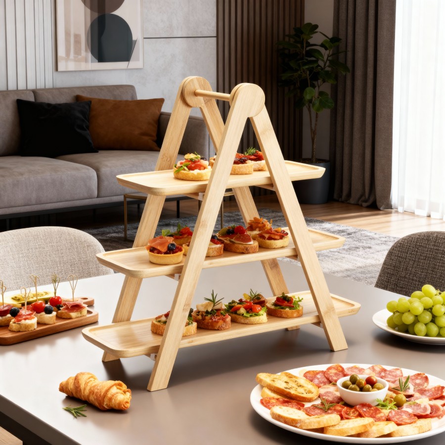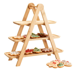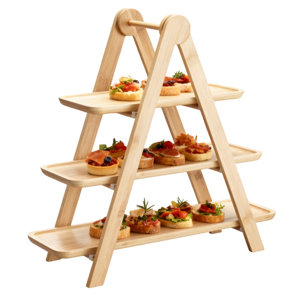 Elegantní třípatrový etažér na servírování, vyrobený z kvalitního bambusu s pevnými PV klipy. Ideální pro podávání dezertů, ovoce, sýrů či slaných pochoutek. Díky přírodnímu provedení a stabilní konstrukci se hodí jak pro každodenní stolování, tak pro slavnostní příležitosti.