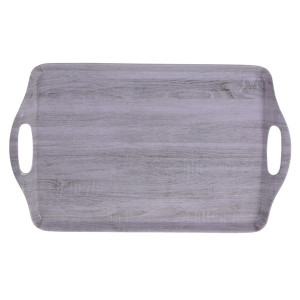 Servírovací podnos se dvěma držadlyMateriál: melaminRozměry: 45 x 30 cmDekor dřevoBarva: šedá