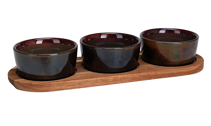 Dotaz na produkt- servírovací set misek pro nejrůznější příležitosti- materiál: kamenina s lesklou glazurou- všechny misky jsou uloženy na stylovém podnosu z akátového dřeva- perfektní pro servírování předkrmů, pochutin, dipů a omáček- žáruvzdorné do 200 °C, misky lze využít také k zapékání- misky jsou vhodné do myčky nádobí- sada obsahuje 3 kusy kulatých misek a 1 podnos- rozměry misky: 10 x 4 cm- rozměry podnosu: 32 x 10,5 x 1,2 cm- barva: hnědá