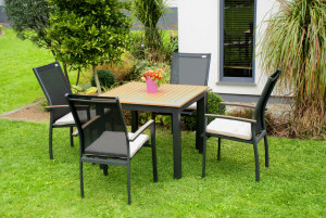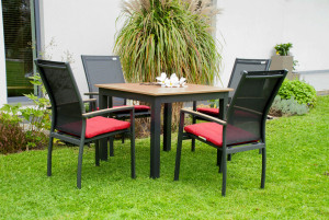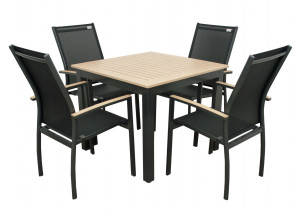 Čtvercový stůl EXPERT WOOD má odolnou hliníkovou konstrukci v antracitové barvě. Žebrovaná hliníková deska stolu má práškový nástřik v dekoru dřeva. Díky tomu je stůl lehký, bezúdržbový a odolný povětrnostním vlivům. Tím se stává zahradním nábytkem s dlouhou životností. Výhodou jsou i regulační kolečka na nohách stolu, které pomáhají vyrovnat výšku desky i na nerovném venkovním povrchu.
