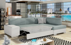 Dotaz na produkt Na splátky ještě dnesFabio je stylová, multifunkční rohová pohovka se stabilní konstrukcí ve tvaru L, která vám bude sloužit po mnoho let. S rozměry 268 x 167 x 73 cm zaručuje maximální pohodlí pro denní relaxaci. Díky rozkládacímu mechanismu typu delfín je pohovka Fabio ideální i pro noční odpočinek. Plocha na spaní o rozměrech 195 x 125 cm zajišťuje dlouhý a klidný spánek. Dalším prvkem tohoto modelu je prostorný prostor na ložní prádlo. Sedák je vyroben z vysoce pružné pěny s vlnitými pružinami, které dohromady poskytují vynikající oporu tělu a zároveň zabraňují nevzhledným promáčklinám a deformacím. Při výběru rohové pohovky Fabio je třeba věnovat pozornost jejímu geometrickému designu inspirovanému New Yorkem, dekorativním polštářům, které jsou součástí sady, a široké škále dostupných barevných možností čalounění. Fabio je kompaktní a praktický kus nábytku, ideální do každého obytného prostoru.Látky: Potah 70, Měkký 17