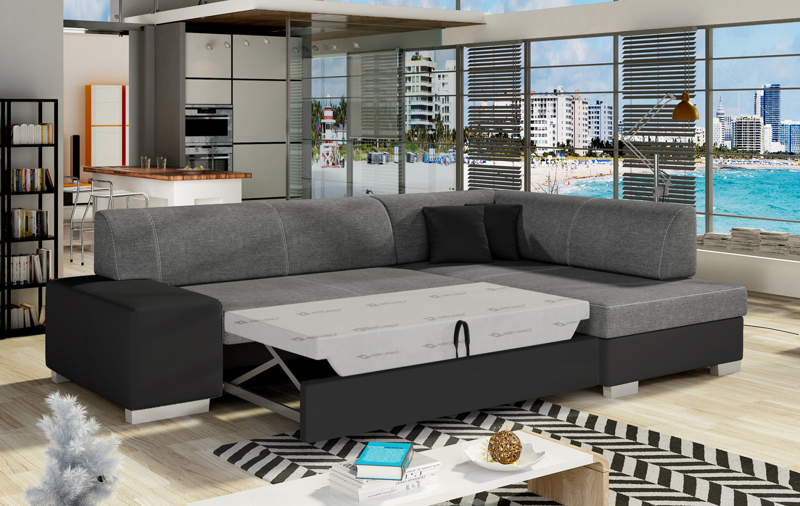 Dotaz na produkt Na splátky ještě dnesFabio je stylová, multifunkční rohová pohovka se stabilní konstrukcí ve tvaru L, která vám bude sloužit po mnoho let. S rozměry 268 x 167 x 73 cm zaručuje maximální pohodlí pro denní relaxaci. Díky rozkládacímu mechanismu typu delfín je pohovka Fabio ideální i pro noční odpočinek. Plocha na spaní o rozměrech 195 x 125 cm zajišťuje dlouhý a klidný spánek. Dalším prvkem tohoto modelu je prostorný prostor na ložní prádlo. Sedák je vyroben z vysoce pružné pěny s vlnitými pružinami, které dohromady poskytují vynikající oporu tělu a zároveň zabraňují nevzhledným promáčklinám a deformacím. Při výběru rohové pohovky Fabio je třeba věnovat pozornost jejímu geometrickému designu inspirovanému New Yorkem, dekorativním polštářům, které jsou součástí sady, a široké škále dostupných barevných možností čalounění. Fabio je kompaktní a praktický kus nábytku, ideální do každého obytného prostoru.Látky: Sawana 05, Soft 11