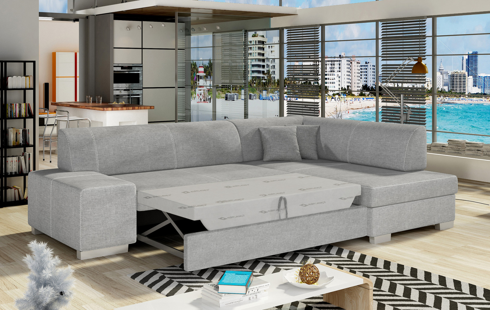 Dotaz na produkt Na splátky ještě dnesFabio je stylová, multifunkční rohová pohovka se stabilní konstrukcí ve tvaru L, která vám bude sloužit po mnoho let. S rozměry 268 x 167 x 73 cm zaručuje maximální pohodlí pro denní relaxaci. Díky rozkládacímu mechanismu typu delfín je pohovka Fabio ideální i pro noční odpočinek. Plocha na spaní o rozměrech 195 x 125 cm zajišťuje dlouhý a klidný spánek. Dalším prvkem tohoto modelu je prostorný prostor na ložní prádlo. Sedák je vyroben z vysoce pružné pěny s vlnitými pružinami, které dohromady poskytují vynikající oporu tělu a zároveň zabraňují nevzhledným promáčklinám a deformacím. Při výběru rohové pohovky Fabio je třeba věnovat pozornost jejímu geometrickému designu inspirovanému New Yorkem, dekorativním polštářům, které jsou součástí sady, a široké škále dostupných barevných možností čalounění. Fabio je kompaktní a praktický kus nábytku, ideální do každého obytného prostoru.Látky: Sawana 21