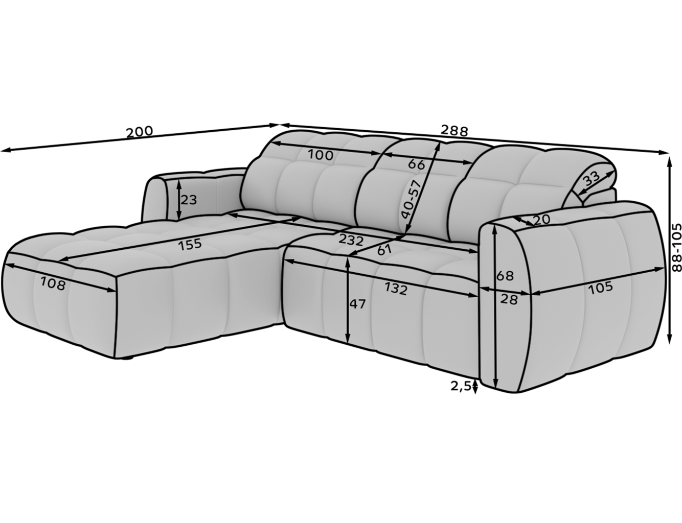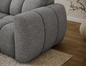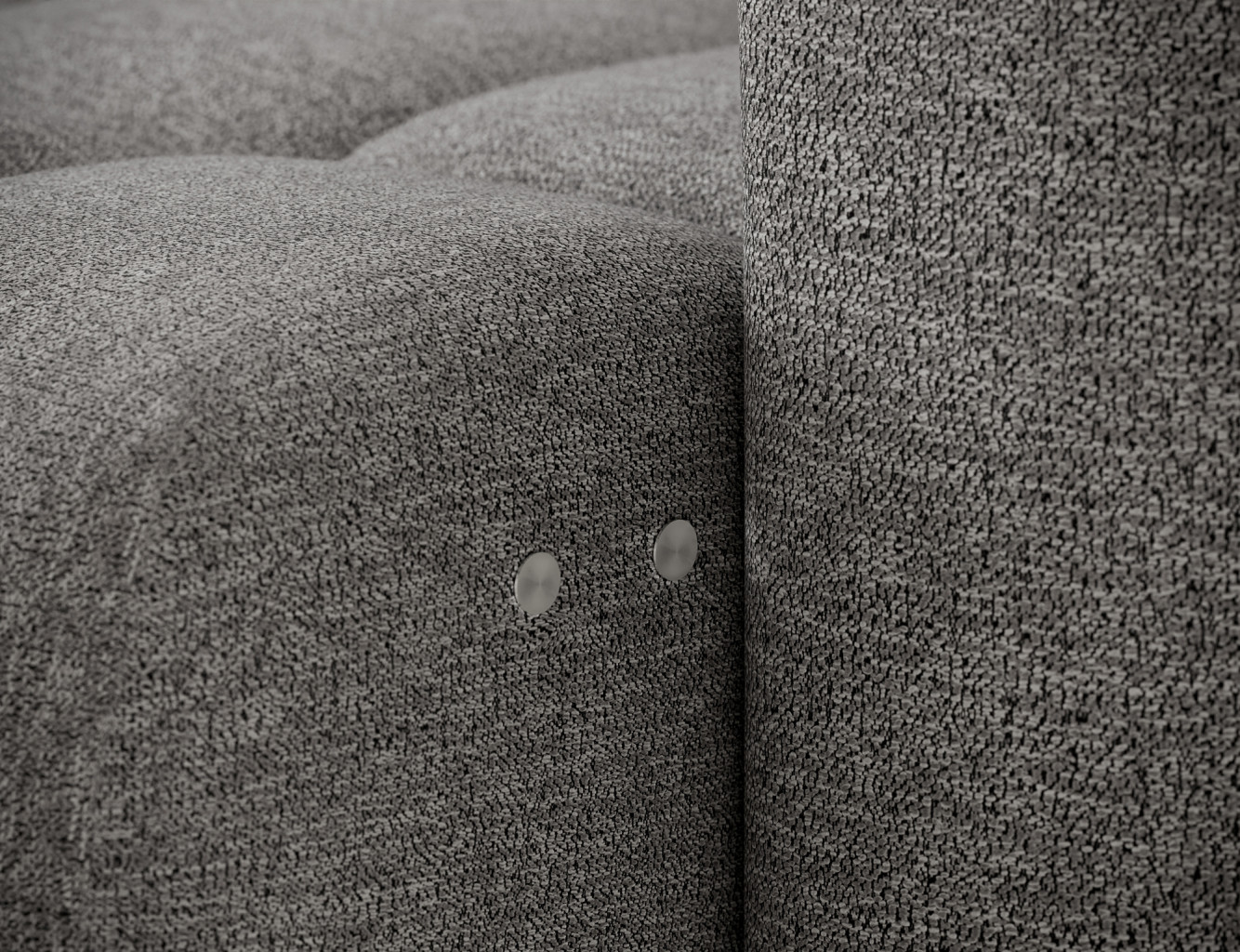 Dotaz na produkt Na splátky ještě dnesRohová pohovka Fanito je moderní, prostorná sedací souprava ve tvaru L určená do obývacího pokoje. Vyznačuje se pevnou, zaoblenou siluetou, hlubokým sedákem a segmentovaným prošíváním, které zdůrazňuje její designový a zároveň útulný charakter – ideální pro domácí relaxační zónu. Model má rozměry 288 × 200 × 105 cm a hmotnost 130,6 kg, což zajišťuje stabilitu a každodenní pohodlí. Výplň sedáku kombinuje vlnité pružiny typu B, vysoce pružnou pěnu HR3030 a prošívanou vatu o gramáži 150 g/m², což poskytuje pružnost, pohodlí a odolnost proti prohýbání, zatímco opěradlo je vyztuženo čalounickými popruhy a profilovanou polyuretanovou pěnou T2316 pro ergonomickou oporu zad. Jako spací sedací souprava nabízí praktickou spací plochu o rozměrech 85 × 232 × 47 cm a elektrické prodloužení sedáku (pohon) o 28 cm umožňuje rychle a bez námahy zvětšit plochu na odpočinek. Mechanismus opěrky hlavy s vratnou pružinou navíc umožňuje pohodlné nastavení opěrky hlavy, což z rohové pohovky Fanito dělá vynikající volbu pro každého, kdo hledá pohodlnou výsuvnou pohovku, která v sobě spojuje styl, funkčnost a vysokou kvalitu zpracování. Látka: Coralline 03