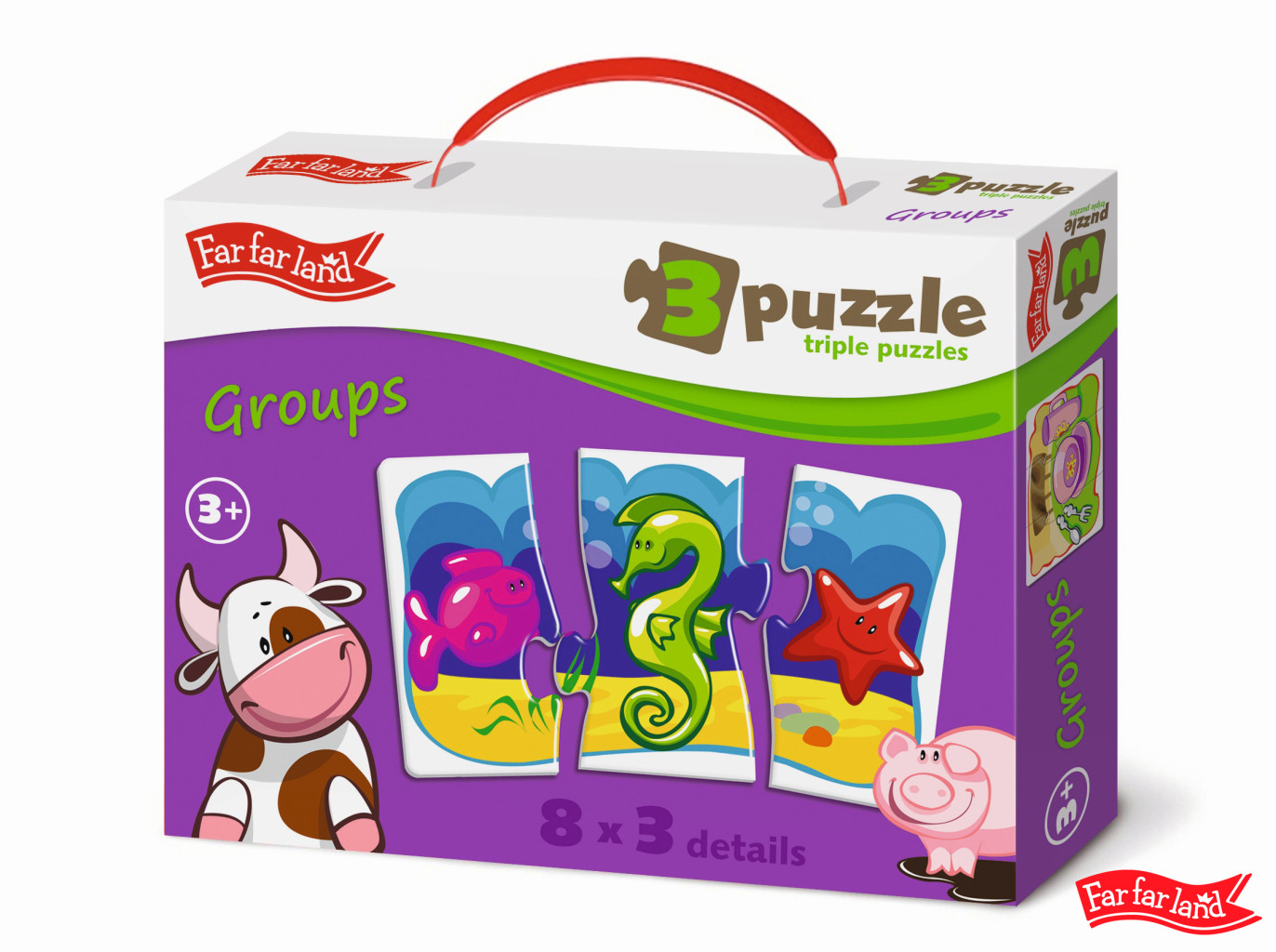 Dotaz na produktFar Far Land Puzzle trojice skupinky. Balení obsahuje 8 puzzle obrázků, které se skládají ze 3 dílků (vyobrazují trojice k sobě patřících předmětů nebo postaviček).