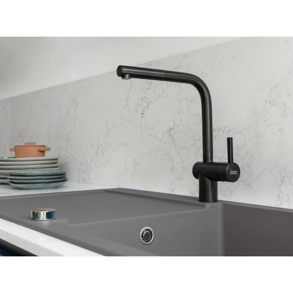 Dotaz na produkt Na splátky ještě dnesOtočná 180°. S vytahovací koncovkou osazenou perlátorem. Opletená sprchová hadice 150 cm. Připojení Hadičky 45 cm. Průtok vody 9,7 l/min. (3 bar). Laminární průtok vody. PVD coating. Není vhodná pro montáž do nerezových dřezů.