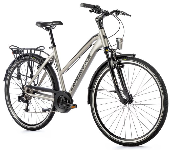 Dámské trekingové kolo Leader Fox FERRARA 28" v hliníkovém rámu, s blatníky a bateriovým LED osvětlením. Užijte si pohodlné cestování po městě nebo odpolední výlety po cyklostezkách Perfektní na jízdu po městě Buďte všude včas, vyhněte se kolonám. Lehké trekingové kolo FERRARA vás pohodlně a hlavně rychle dopraví všude po městě i na vzdálenější místa po přilehlých cyklostezkách. Jízdu za tmy vám zpříjemní kvalitní LED osvětlení, které vás bezpečně dovede až domů. Kolo Leader Fox FERRARA 2023 je dále vybaveno zadním nosičem pro váš batoh, kabelku nebo košík s nákupem. Odpružená přední vidlice vám zajistí komfortní jízdu za všech okolností. Přehazovat můžete jednoduše mezi 8 rychlostními stupni. Jízdní kola Leader Fox se vyvíjí a montují v České republice My v Leader Foxu jsme tu proto, abyste mohli žít aktivně a užívat si svůj volný čas, jak právě chcete. Přesně pro tento účel navrhujeme a vyrábíme široký sortiment kol včetně elektrokol.