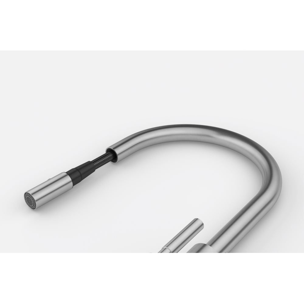 Otočná 360°. S vytahovací koncovkou osazenou perlátorem. S regulací Sprcha/Proud. Opletená sprchová hadice 170 cm. Připojení Hadičky 55 cm. Průtok vody 7,74 l/min. (3 bar). Laminární průtok vody. Není vhodná pro montáž do nerezových dřezů.