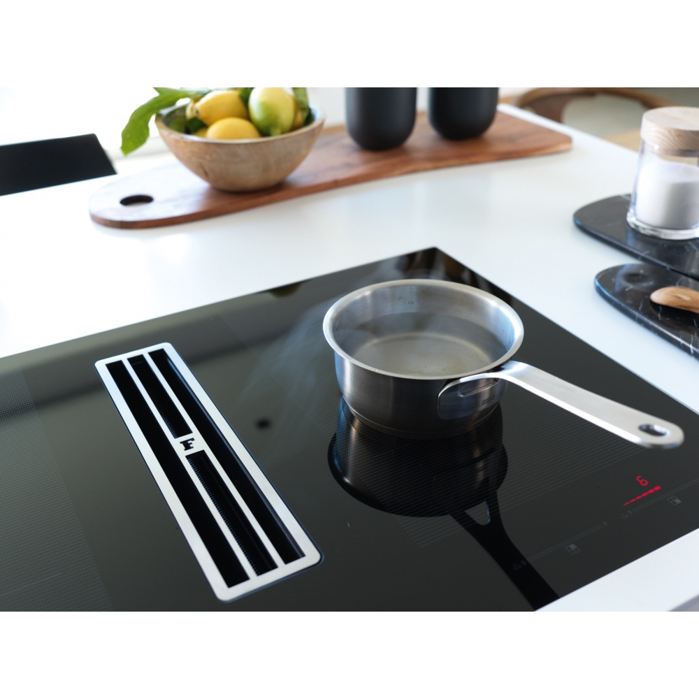 Dotaz na produkt Na splátky ještě dnesOdsavač par v indukční varné desce Maris 2Gether Steel. Provedení černé sklo. Energetická třída A+. Odsavač par: Montáž do pracovní desky. Šířka 83 cm. Ovládání: Senzorové. Digitální červený displej + Dotykový ovladač typu Slide. 9 Stupňů výkonu, 1× Intenzivní stupeň. Automatická aktivace s varnou deskou. Voděodolný motor. Nerezová mřížka. Max. výkon 630 m3/h (Norma EN 61591). Součástí odsavače par je vyjímatelný kolektor na tekutinu (V případě náhodné vylití tekutiny do odsavače par). Indukční varná deska: 4 Varné zóny. 2× Flexi zóna. Ovládání: 4 Dotykové ovladače typu Slide. 9 Úrovní ohřevu. Funkce: Rozpouštění. Booster. Stop&Go. Dětský zámek. Časovač 4×. Odsavač par i indukce jsou perfektně integrovány. Odsávání je aktivováno automaticky, jakmile je varná deska v provozu. MODEL POUZE PRO VNĚJŠÍ ODTAH.