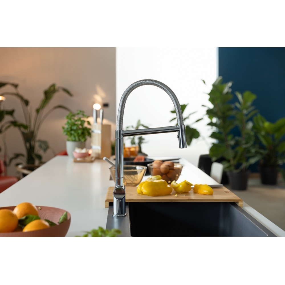 Inspirativní navenek, inovativní uvnitř. Tajemstvím šetrnosti k životnímu prostředí je ECO kartuše, navržená tak, aby omezovala průtok i teplotu, pomáhá aktivně šetřit vodu i energii. Díky stupňovitému ovládání páčkou je možné snížit spotřebu vody až o 50%. Pootočením kolečka na kartuši můžete také omezit max. možnou teplotu vody tekoucí z baterie. Otočná 180°. S koncovkou na pružině osazenou perlátorem. S regulací Sprcha/Proud. Hadice s kovovou pružinou. Připojení Hadičky 55 cm. Průtok vody 7,5 l/min. (3 bar). Technologie pro úsporu vody. ECO kartuše. Není vhodná pro montáž do nerezových dřezů.