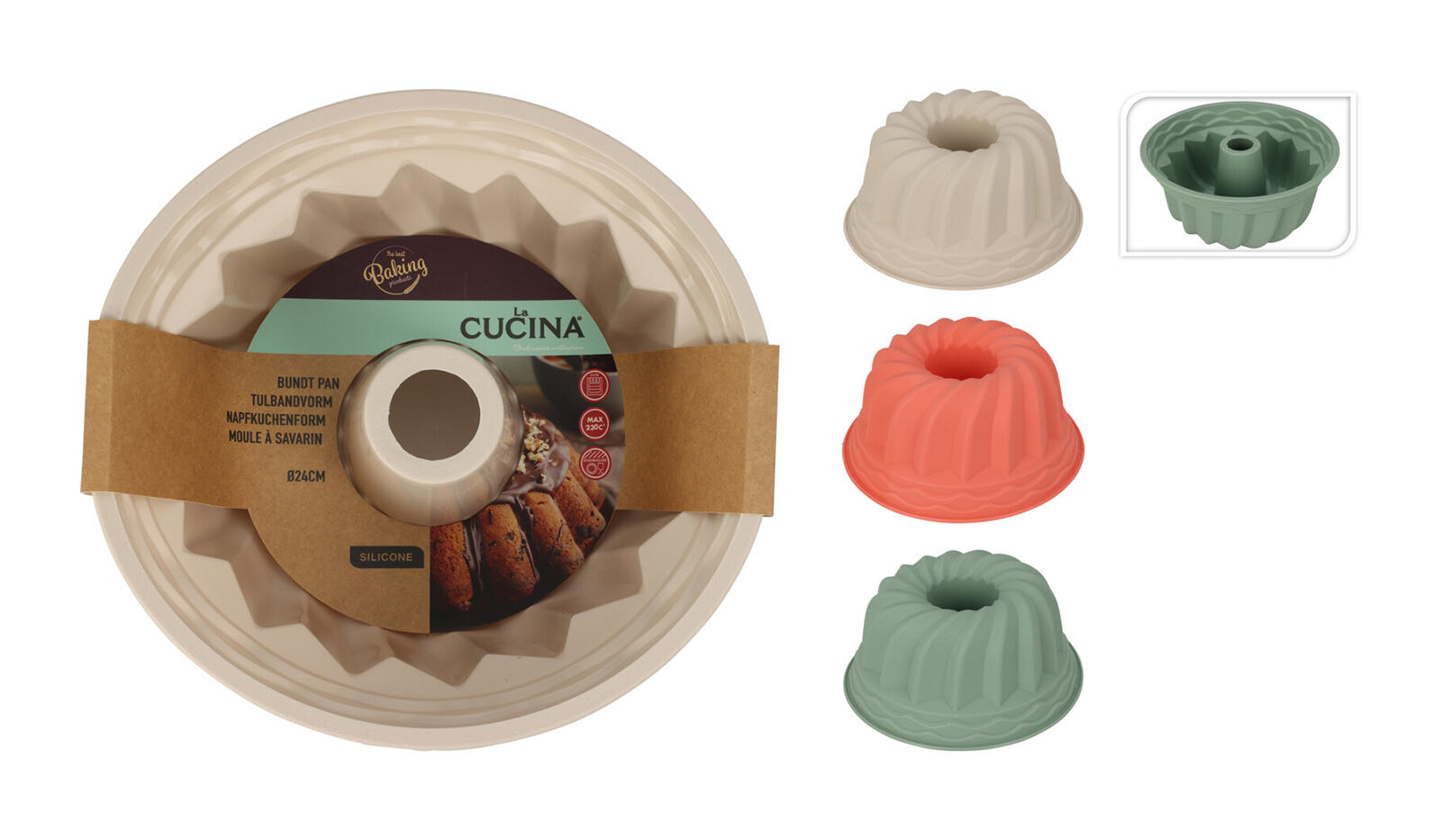 Dotaz na produktForma na bábovku 24 cm, silikon mix barev.průměr: 24 cmmateriál: silikonmix barev: zelená, béžová, korálovámikrovlnka: anomyčka: ano Silikonová forma na domácí bábovku je odolná vůči vysokým teplotám (do 240°C), lze jí používat do mikrovlnné trouby a do myčky na nádobí.Nepřejímá chutě ani pachy pokrmů.Není náročná na údržbuNení nutné ji před pečením vymazávat a vysypávat.
