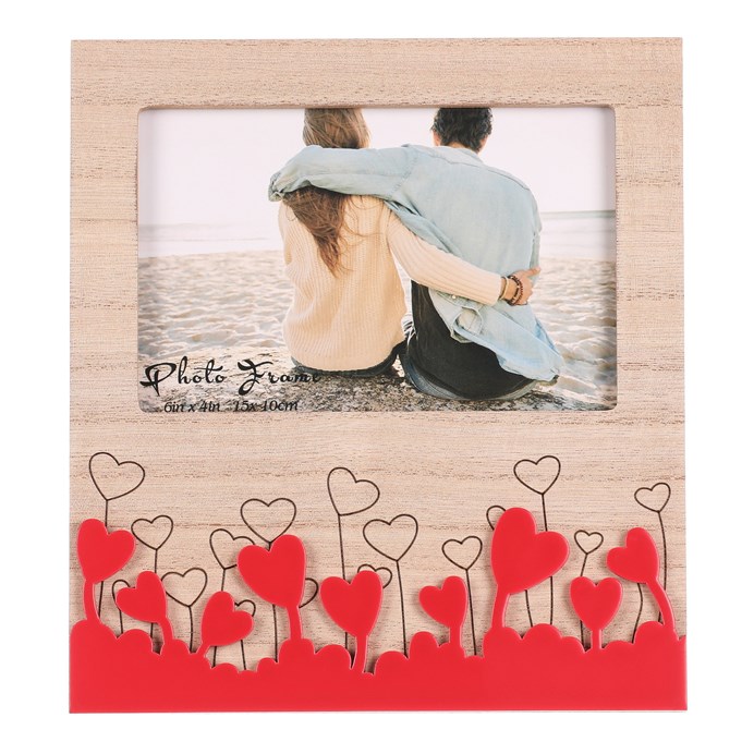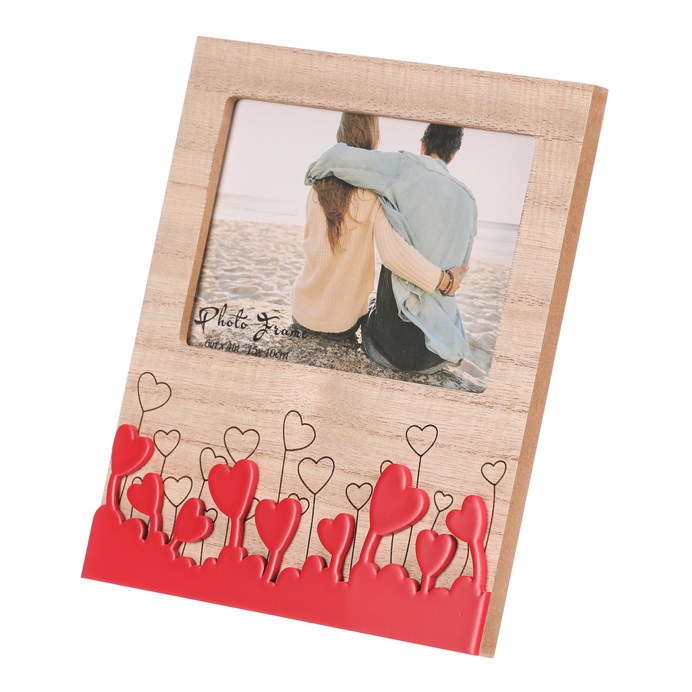 Dotaz na produktTento rámeček pro fotky o rozměrech 15 x 10 cm je jako stvořený pro vaše společné fotografie plné lásky a štěstí. Rám vyrobený z MDF desky v přírodní barvě dřeva, zaujme svým jemným detailem – motivy červených srdíček ve spodní části. Perfektní doplněk na poličku nebo stůl, který bude neustále připomínat vaše společné chvíle plné lásky a radosti.