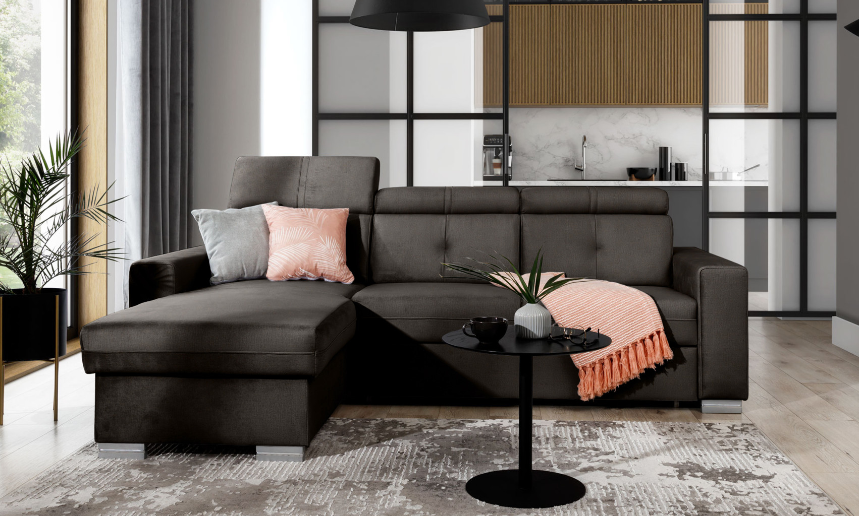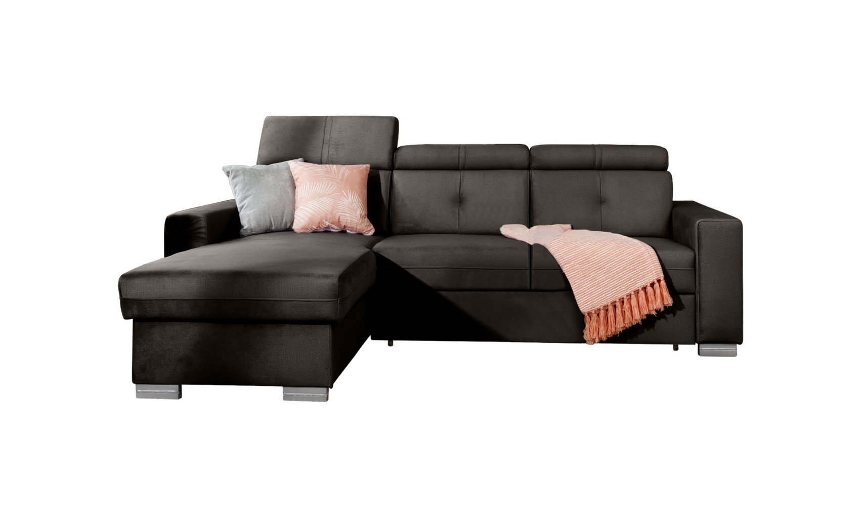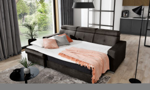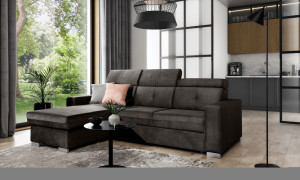 Dotaz na produkt Na splátky ještě dnesRohová pohovka Fresia je kus nábytku ve tvaru L, který vypadá skvěle a byl navržen s ohledem na blažený odpočinek. Kromě estetických hodnot je také velmi funkční a pohodlná, protože je vybavena 3 pohyblivými opěrkami hlavy. Fresia je kus nábytku o šířce 247 cm, hloubce 176 cm a výšce 104 cm. Dřevěné a chromované nohy Fresie o délce 5,5 centimetru jsou krásnou dekorací a zdůrazňují její elegantní vzhled. Další výhodou rohové pohovky je přihrádka na ložní prádlo, díky které můžete udržovat obývací pokoj nebo pokoj pro hosty uklizený. Funkce rozkládání také poskytuje spací plochu o rozměrech 204 x 126 cm – skvělá volba v případě nečekané návštěvy hostů. Mechanismus používaný k otevírání rohové pohovky je velmi oblíbeného a pohodlného typu delfín. Působivé čalounění z kolekce ELTAP dodává tomuto kusu nábytku charakter a styl. Nabídka zahrnuje klasické i originálnější barvy. Díky sedáku vyplněnému pěnou T30 poskytuje rohová pohovka stabilní oporu a pohodlný odpočinek. Další důležitou součástí čalouněného nábytku jsou pružiny. V rohové pohovce Fresia byla použita vlnitá pružina typu B, takže sedák tohoto kusu nábytku je pružnější a ohnutý, a proto extrémně pohodlný. Látky: Nube 22