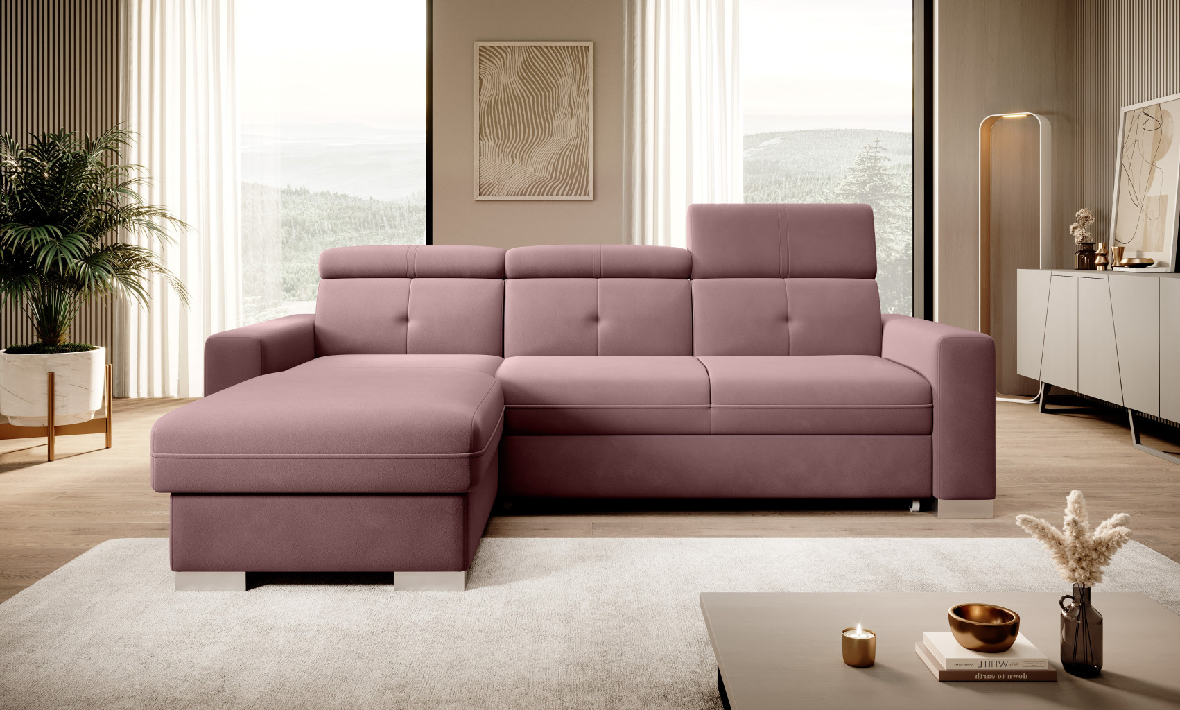 Dotaz na produkt Na splátky ještě dnesRohová pohovka Fresia je kus nábytku ve tvaru L, který vypadá skvěle a byl navržen s ohledem na blažený odpočinek. Kromě estetických hodnot je také velmi funkční a pohodlná, protože je vybavena 3 pohyblivými opěrkami hlavy. Fresia je kus nábytku o šířce 247 cm, hloubce 176 cm a výšce 104 cm. Dřevěné a chromované nohy Fresie o délce 5,5 centimetru jsou krásnou dekorací a zdůrazňují její elegantní vzhled. Další výhodou rohové pohovky je přihrádka na ložní prádlo, díky které můžete udržovat obývací pokoj nebo pokoj pro hosty uklizený. Funkce rozkládání také poskytuje spací plochu o rozměrech 204 x 126 cm – skvělá volba v případě nečekané návštěvy hostů. Mechanismus používaný k otevírání rohové pohovky je velmi oblíbeného a pohodlného typu delfín. Působivé čalounění z kolekce ELTAP dodává tomuto kusu nábytku charakter a styl. Nabídka zahrnuje klasické i originálnější barvy. Díky sedáku vyplněnému pěnou T30 poskytuje rohová pohovka stabilní oporu a pohodlný odpočinek. Další důležitou součástí čalouněného nábytku jsou pružiny. V rohové pohovce Fresia byla použita vlnitá pružina typu B, takže sedák tohoto kusu nábytku je pružnější a ohnutý, a proto extrémně pohodlný. Látky: Velvetmat 24