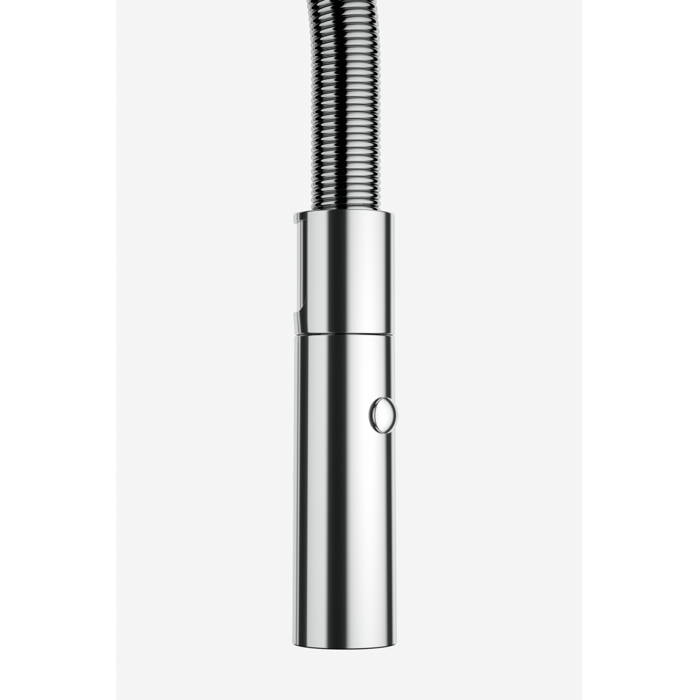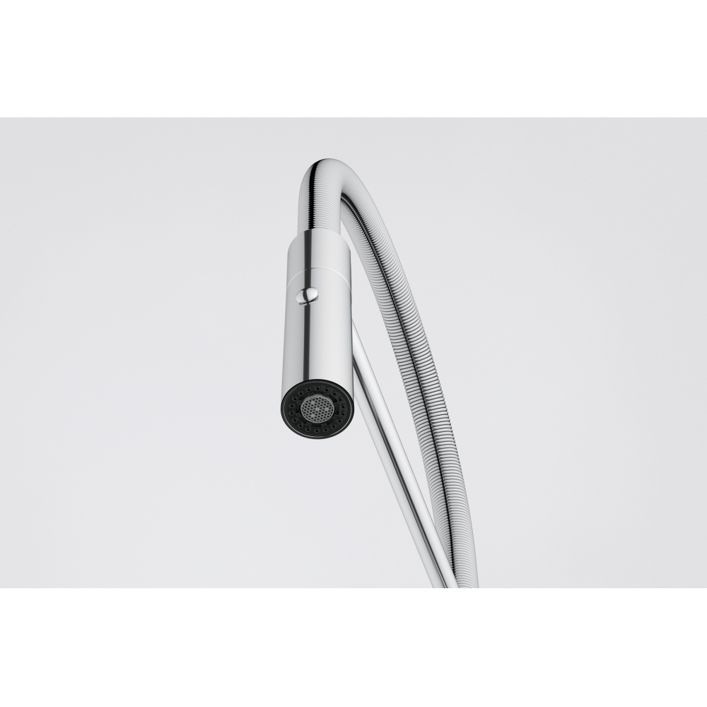 Otočná 360°. S koncovkou na pružině osazenou perlátorem. S regulací Sprcha/Proud. Hadice s kovovou pružinou. Připojení Hadičky 45 cm. Průtok vody 8,4 l/min. (3 bar). Laminární průtok vody. Technologie pro úsporu vody.