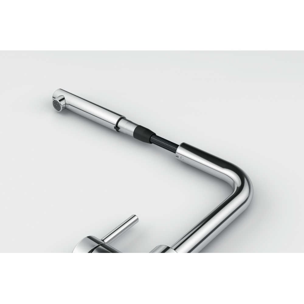 Otočná 360°. S vytahovací koncovkou osazenou perlátorem. Opletená sprchová hadice 150 cm. Připojení Hadičky 45 cm. Průtok vody 7,2 l/min. (3 bar).