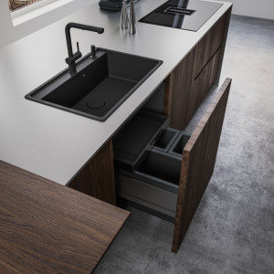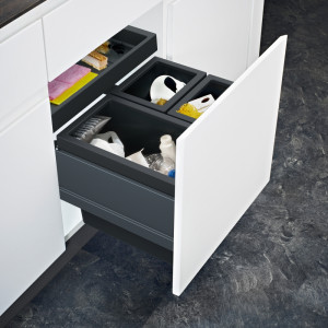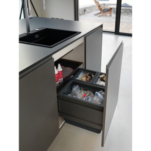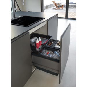 Dotaz na produkt Na splátky ještě dnesČelní výsuv. Min. montážní prostor 564 × 506 × 448 mm. Barva černá/šedá. 3 Koše (1× 26 l, 2× 11 l). Výsuvná zásuvka nad košem v ceně koše. Výsuvná zásuvka obsahuje aktivní uhlíkový filtr, který pohlcuje nepříjemné pachy. Součástí koše je plnovýsuv s tlumením, které zaručuje tichý dojezd. (Výsuv od firmy GRASS).