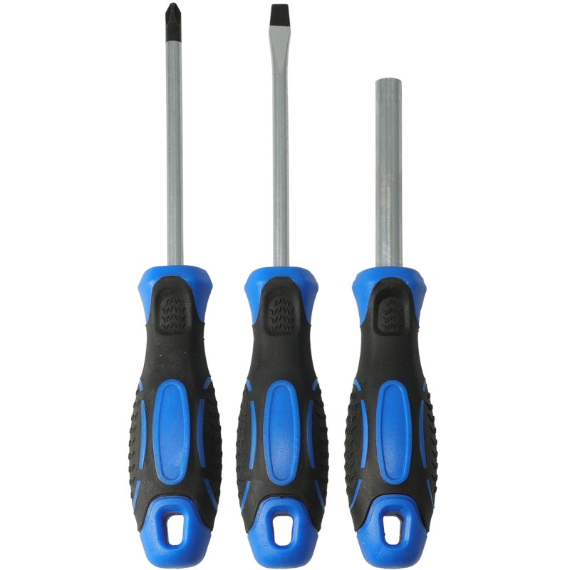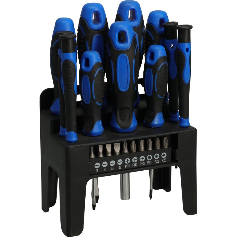 Praktická sada šroubováků s držákem, v modro-černém provedení, baleno v zásobníku s PP smrštovacím obalem.