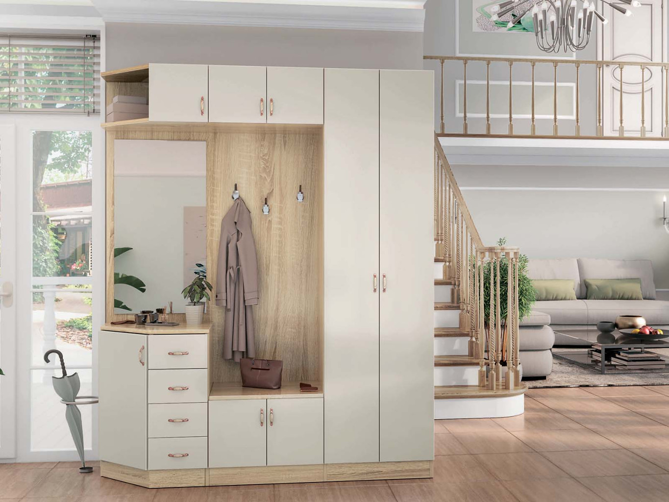 Součástí sestavy je šatní skříň, praktické věšáky, zrcadlo, botník a doplňkové skříňky, které spolu vytvářejí komplexní řešení pro organizovanou předsíň. Zrcadlo zároveň opticky zvětšuje prostor a zvyšuje komfort při každodenním používání.