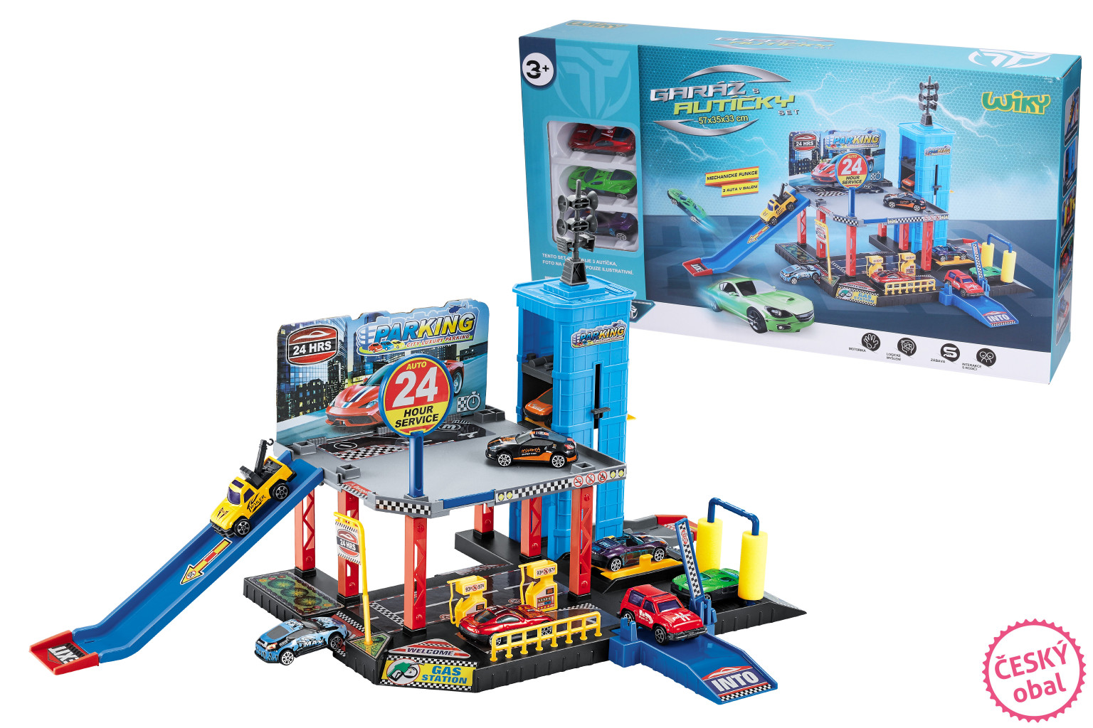 Dotaz na produktGaráž s výtahem a čerpací stanicí. Rozměry sestavené garáže 57x35x33 cm. Balení obsahuje 3 kovová autíčka 7 cm, volná kola.