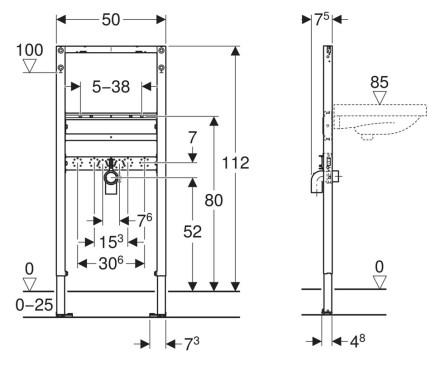 - s výsuvnou deskou pro boční upevnění nad montážním prvkem na kovové nebo dřevěné profily nebo na systémové stojiny Geberit Duofix