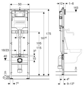 šířka 500 mmhloubka 120 mmvýška 1750 mmteplota vody max. 25 °Csplachovací množství, nastavení ve výrobě 6/3 lvelké splachovací množství – 4,5/6/7,5 lmalé splachovací množství – 3–4 lprůtok při tlaku...