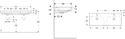 šířka 120 cmhloubka 48 cmvýška 16,5 cmmateriál sanitární keramikabarva bílá2 otvory pro baterii s viditelným přepademlze kombinovat s polosloupymožnost kombinace se skříňkou pod umyvadloupevnění ke...