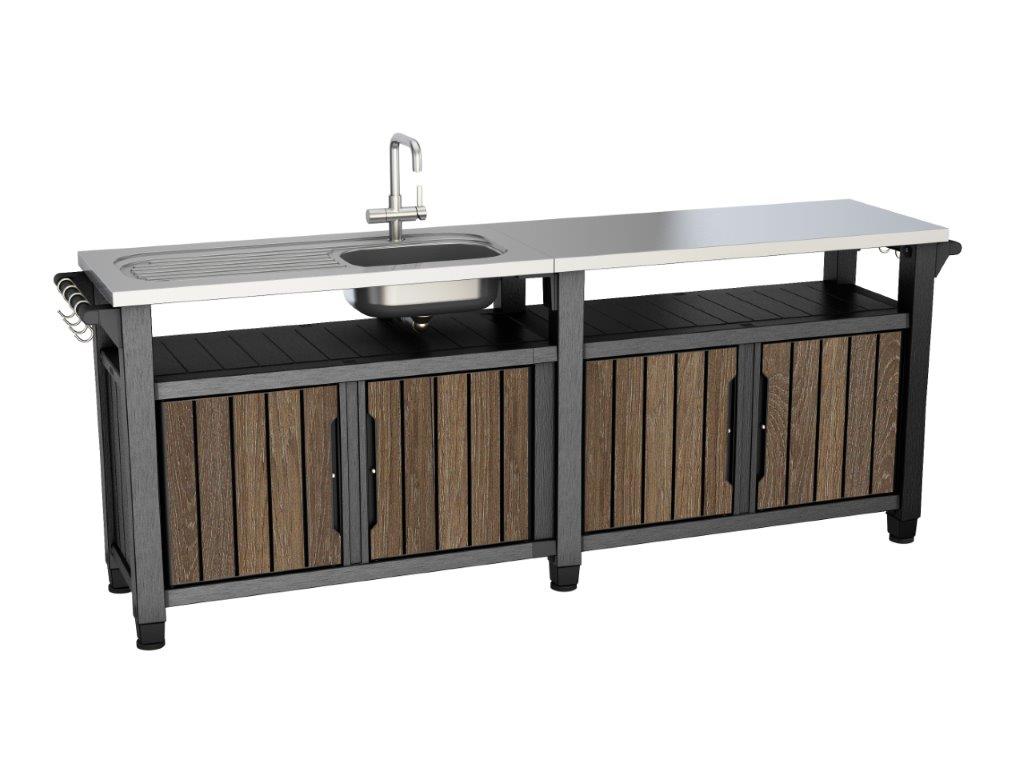 Dotaz na produkt Na splátky ještě dnesRádi si v létě posedíte s rodinou a s přáteli venku na zahradě? Holdujete grilovaným pokrmům? Grilovací stolek Keter Unity Chef nabízí úžasnou kapacitu 415 litrů pro uložení kuchařského náčiní. Nerezová pracovní deska, integrovaný dřez, praktická rukojeť s háčky na pověšení utěrek, nastavitelné nohy stolku, otvírák na láhve a extra velká užitná police na skleničky a talíře dohromady vytvářejí dokonalý kuchyňský ostrůvek pro venkovní vaření, grilování, přípravu a servírování pokrmů a nápojů i pro mytí a utírání nádobí. Tento multifunkční grilovací stůl si prostě zamilujete!