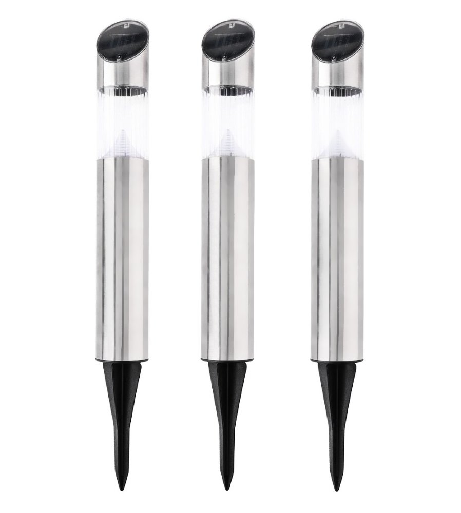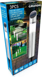 Dotaz na produktS těmito robustními solárními svítidly vyrobenými z nerezové oceli od Grundig můžete úžasně předvést svou zahradu. Každé solární svítidlo O6xH36cm je ukotveno v zemi pomocí přiloženého zemního bodce.Tělo svítidla je vyrobeno z nerezové oceli. Dekorativní vložka lampy z plastu se dvěma studenými bílými LED diodami dokonale završuje celkový design. Díky použité LED a solární technologii je toto osvětlení obzvlášť dlouhotrvající a energeticky úsporné.Světlo se během dne nabíjí solárním panelem a automaticky se zapíná při setmění pomocí integrovaného světelného senzoru.Podrobnosti sada solárního světla- Značka: Grundig- LED solární lampy včetně zemnícího hrotu- Tělo z nerezové oceli, stříbrná- Ozdobná vložka lampy z plastu- Solární napájení- Integrovaná baterie (1,2V typ AAA, Ni-MH 600mAh)- Světelný senzor- Zap. /vypínač (ve Světle)- Vysoká účinnost s nízkou spotřebou energie- každá 2x LED studená bílá (nelze vyměnit)- Celková velikost se zemním hrotem: O6xH53,5cmkaždá - Velikost každé solární lampy: O6xH36cm každá- Celková hmotnost: cca 0,8kg- Rozsah dodávky: 3x solární lampa včetně hrotu