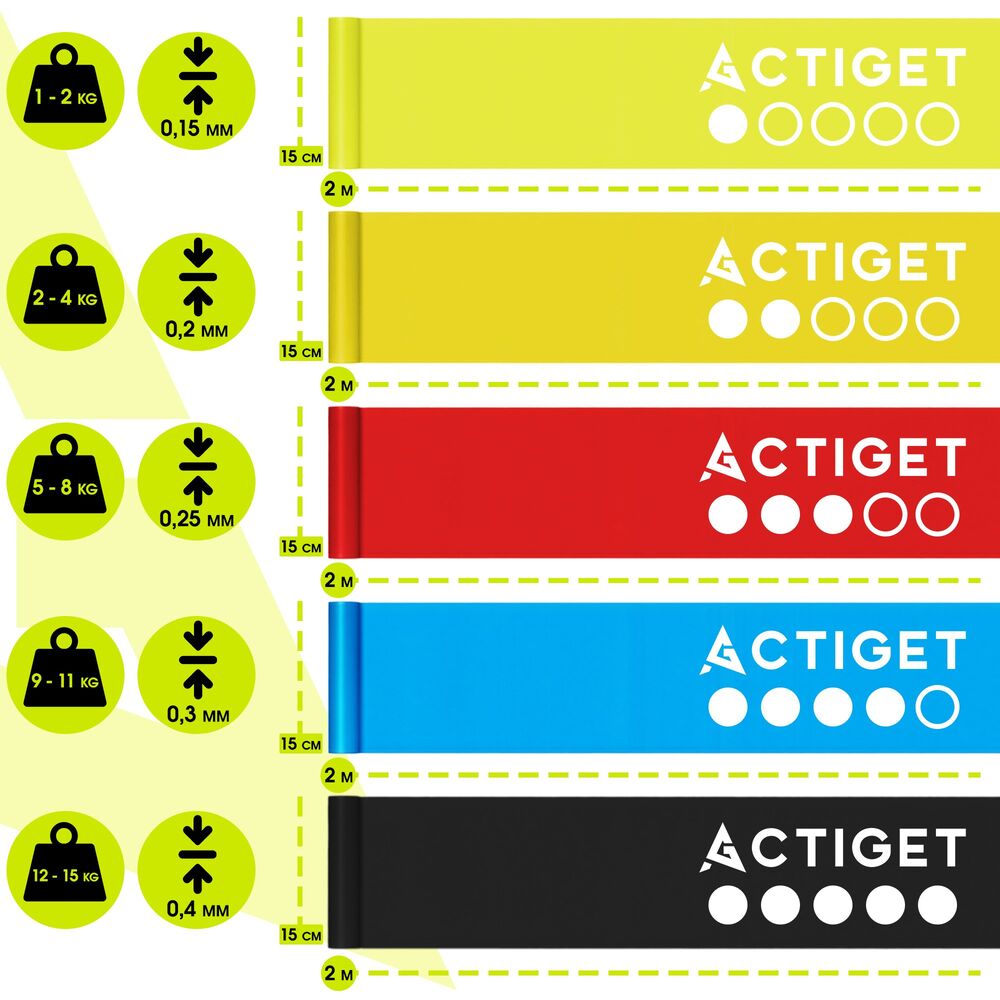 Gumy na cvičení 5ks ACTIGET ACT0105 jsou univerzální pomůckou pro posílení svalů, zlepšení mobility i rehabilitační cvičení. Nabízí 5 úrovní odporu od 1 do 15 kg, takže si snadno přizpůsobíte intenzitu podle své kondice. Díky délce 2 m bez natažení umožňují širokou škálu cviků doma i ve fitku.
