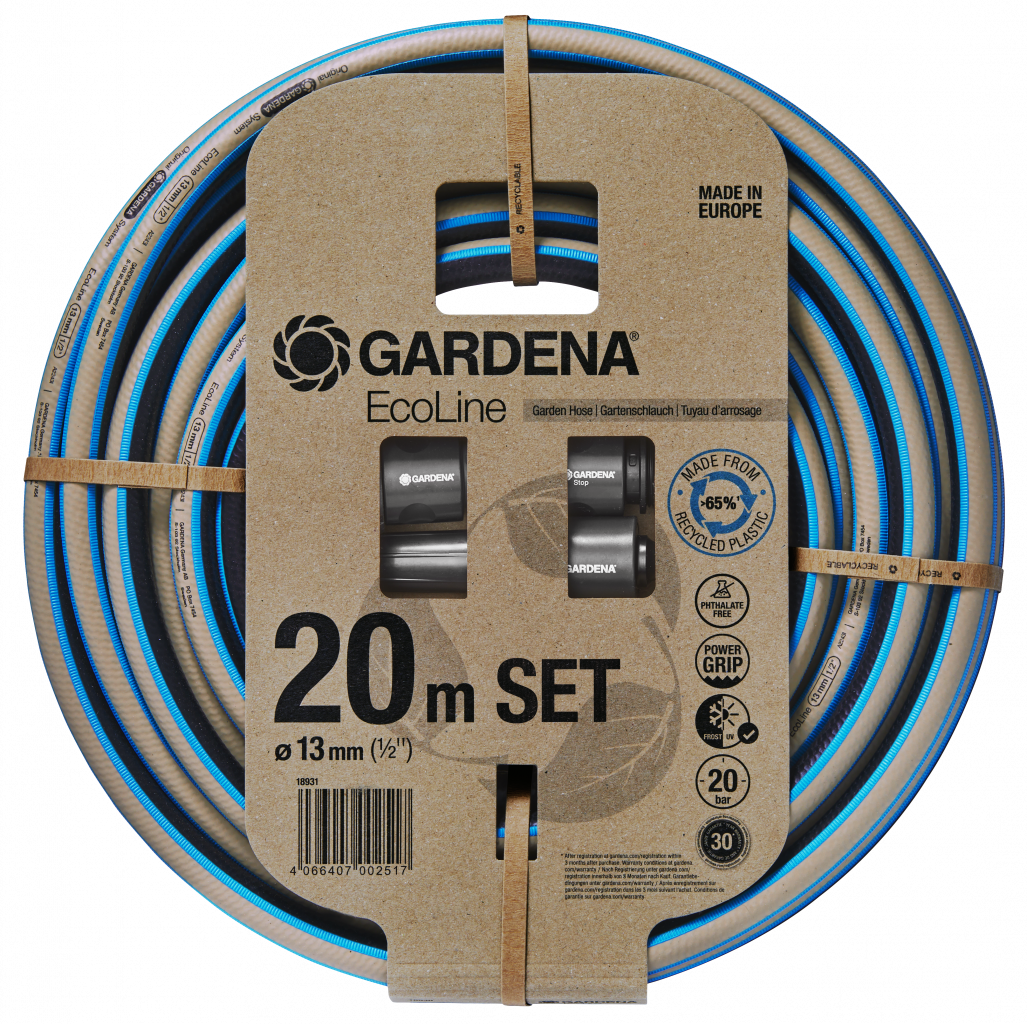 Dotaz na produkt Na splátky ještě dnesUdržitelná sada s hadicí GARDENA EcoLine 13 m (1/2") vás vybaví vším, co potřebujete pro ekologické zavlažování zahrady. Můžete začít hned. Praktická sada obsahuje 20 m dlouhou hadici a také EcoLine komponenty Basic, jako je šroubení na vodovodní kohoutek s adaptérem, hadicová spojka, stopspojka a postřikovač. Hadice je vyrobena z materiálu TPE a použité plastové komponenty jsou vyrobeny z více než 65 % z recyklovaného materiálu, především z domovního odpadu jako jsou např. obaly. Plast použitý pro základní sadu je vyroben z více než 90 % recyklovaného materiálu, rovněž převážně z domovního odpadu. Kromě recyklovaného plastu byl na kovový prvek použit také nerezový kov, který je z více než 35 % recyklován. Sada nejen dobře vypadá, ale také zajišťuje dlouhé používání díky kvalitnímu zpracování. Proto je tato sada ideální v případě, že chcete aktivně chránit životní prostředí. Hadice EcoLine neobsahuje ftaláty ani škodlivé látky (< 0,1 %. Profil Power Grip zajišťuje stabilní spojení a optimální držení mezi hadicí a hadicovou spojkou nebo stopspojkou. Hadice je při používání obratná a lehká. Sada je odolná vůči UV záření a mrazu, takže ji můžete skladovat venku po celý rok. Tlak, při kterém dojde k prasknutí hadice, činí 20 barů. Rozprašovací proud posřikovače 2 v 1 nabízí vhodný proud pro různé situace. Můžete plynule přepínat mezi bodovým paprskem pro úklidové úkoly a jemným rozprašovacím proudem pro zavlažování. Stopaspojka, která je součástí sady, umožňuje výměnu nástavců, aniž byste museli chodi k vodovodnímu kohoutku: voda se po odpojení koncového přístroje automaticky zastaví a pokračuje v toku až po instalaci nového nástavce. Hadice GARDENA EcoLine 13 mm (1/2") prodávaná jako sada je produkt udržitelné kvality vyrobený v Evropě a je podporován společností GARDENA 30letou zárukou po registraci na adrese gardena.com/registration do 3 měsíců od zakoupení. Přirozená volba pro vášnivé zahrádkáře. Nová řada EcoLine. Udržitelně vyrobená. Esteticky navržená. Odolně konstruovaná.