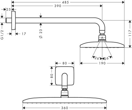 - horní sprchu lze natočit až do úhlu 26° v každém směru