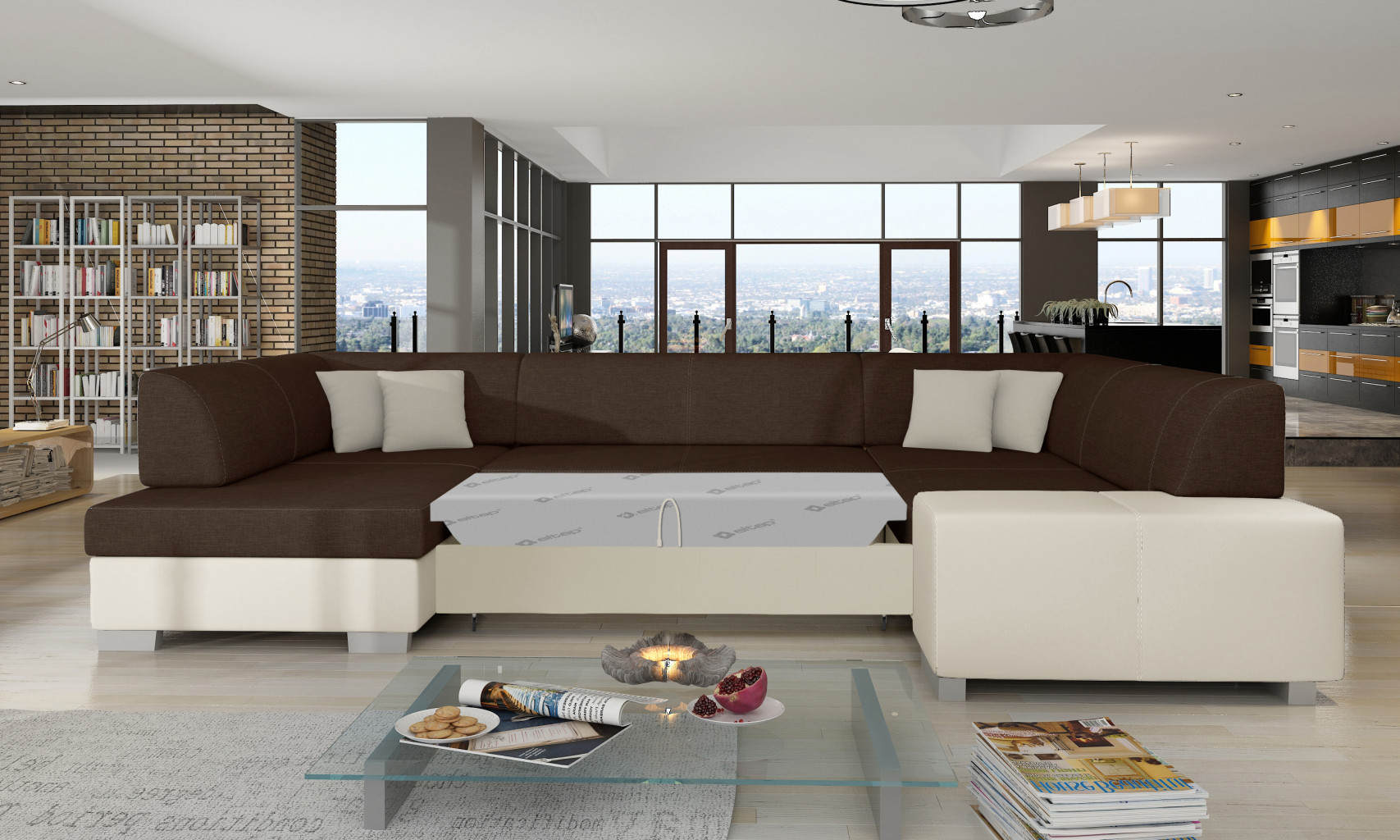 Dotaz na produkt Na splátky ještě dnesHavana je prostorná, luxusní čalouněná rohová pohovka o rozměrech 320 x 167/207 x 73 cm, takže poskytuje dostatek prostoru pro relaxaci. Tento kus nábytku ve tvaru U má pohodlný, měkký sedák vyrobený z odolné vlnité pružiny a pružné pěny T30, takže je celek odolný proti promáčknutí. Naše rohová pohovka je vybavena funkcí spaní a dostatečným úložným prostorem pro ložní prádlo. Intuitivní systém rozkládání delfín umožňuje snadno proměnit pohovku v postel o rozměrech 280x125 cm a získat tak opravdu velkou plochu pro noční odpočinek. Mezi další specifikace naší rohové pohovky Havana patří: klasický, osvědčený design, důraz na detail zpracování, jednoduchý geometrický střih. Rohová pohovka je dodávána také s velkými dekorativními polštáři. Havana je ztělesněním pohodlí a dobrého stylu, které se dokonale hodí do více než jednoho interiéru.Látky: Sawana 26, Soft 33