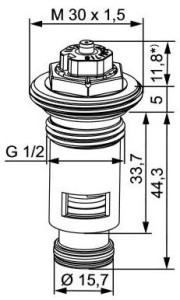 připojení G 1/2"pro hlavice M30x1,5tlaková třída PN10maximální provozní teplota 120 °Cventilová vložka mosaz, PPS (VHV, VHF, VHV8S, VHF8S)o-kroužky EPDMkuželka ventilu EPDMzpětná pružina nerezdřík...
