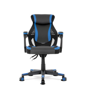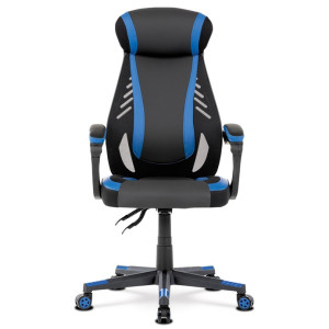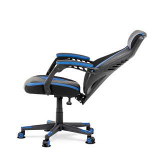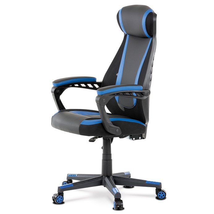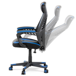 Vysoký, prodyšný a ergonomicky navržený opěrák s integrovanou zesílenou opěrkou hlavy, polstrovanou a výškově nastavitelnou bederní opěrkou slouží nejen jako výborná opora celých zad a také podporuje správné držení páteře. Područky jsou plastové, polstrované a potažené modrou a černou ekokůží. Šíře je 7 cm, délka ložné plochy 33 cm a výška 3 cm. Při sklápění sedáku se pohybují a kopírují jeho pohyb a polohu. Nosnost židle je až 130 kg.