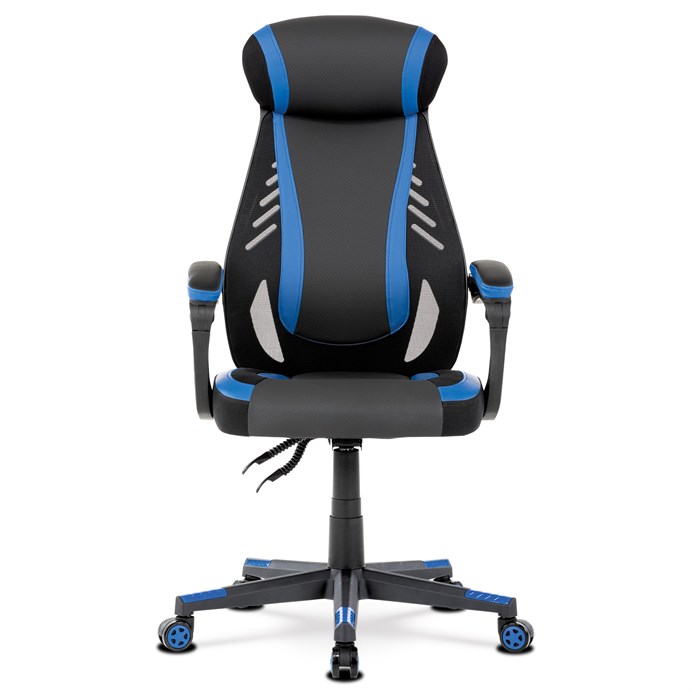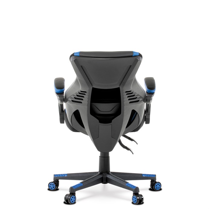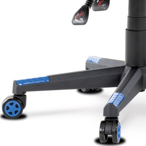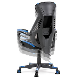 Křeslo je vybaveno houpacím mechanismem s plynulou aretací. Při vypnutí je možné se s opěradlem volně pohupovat. Výška sezení se upravuje jednou páčkou na pravé straně přes kvalitní plynový píst. Poloha opěráku se nastavuje druhou páčkou, umístěnou rovněž na pravé straně křesla. Masivní černý plastový kříž s modrými protiskluzovými plastovými doplňky je osazen černými plastovými kolečky pr. 6 cm s modrým racing středem a gumovým obvodem ideálními na tvrdé podlahy. Se stabilitou celých 70 cm průměru kříže si můžete dovolit i ty nejnáročnější hry.