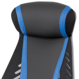 Potah je kombinací modré a černé perforované ekokůže na sedáku i opěráku, černé síťoviny MESH a černé, jemně hrubé látky látky na sedáku i bocích opěrky hlavy. Opěrák je černý plastový výlisek ve futuristickém designu. Výplň sedáku i hlavové opěrky je z velmi kvalitní a tuhé PU pěny, vyztužení a pružnost zajišťují látkové popruhy.
