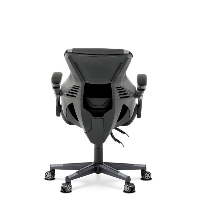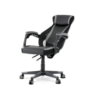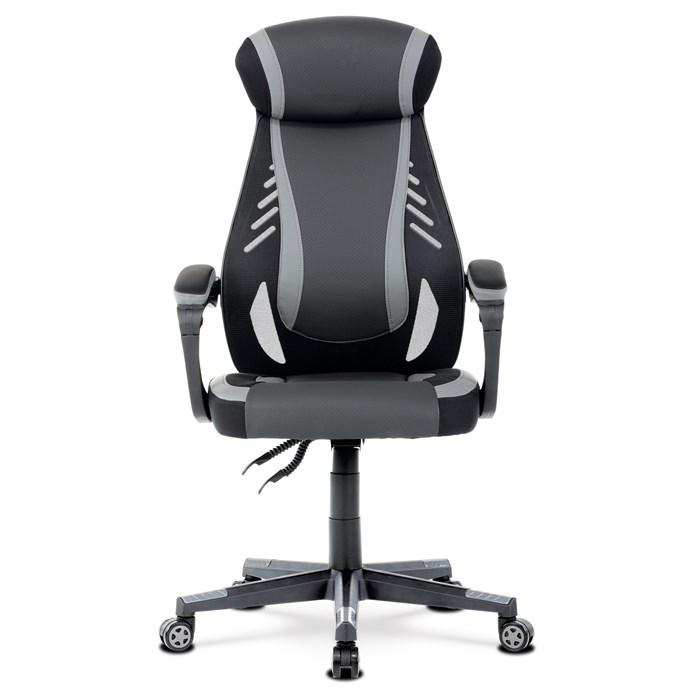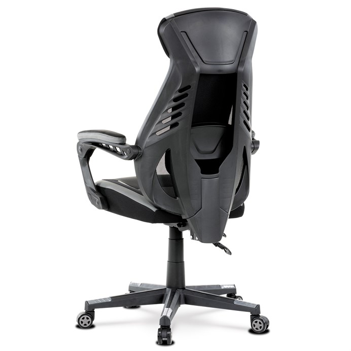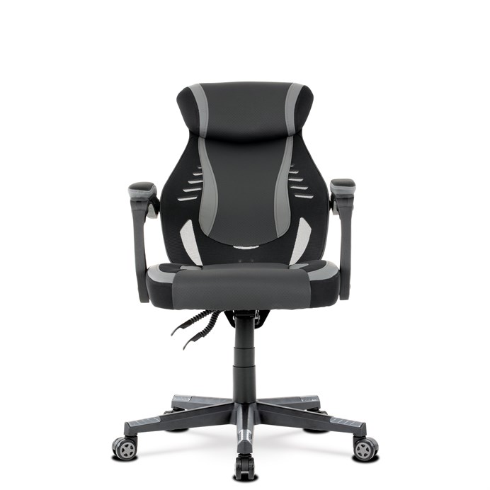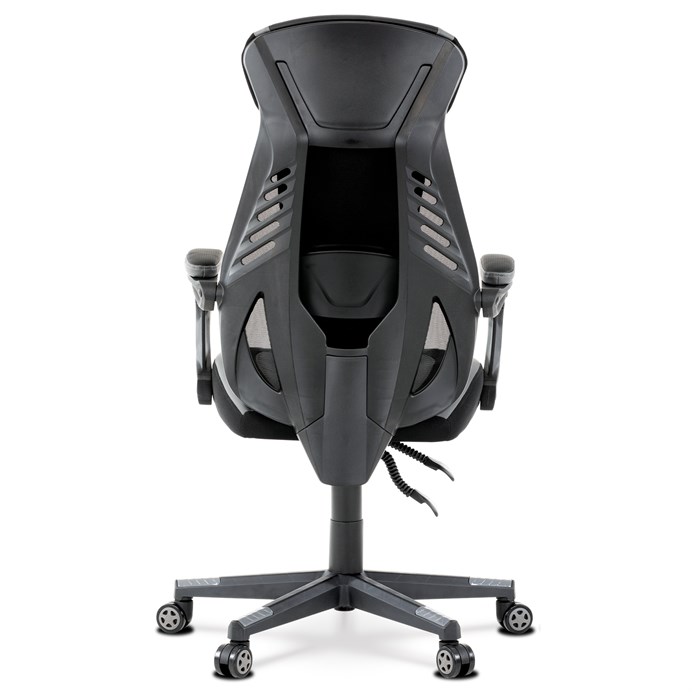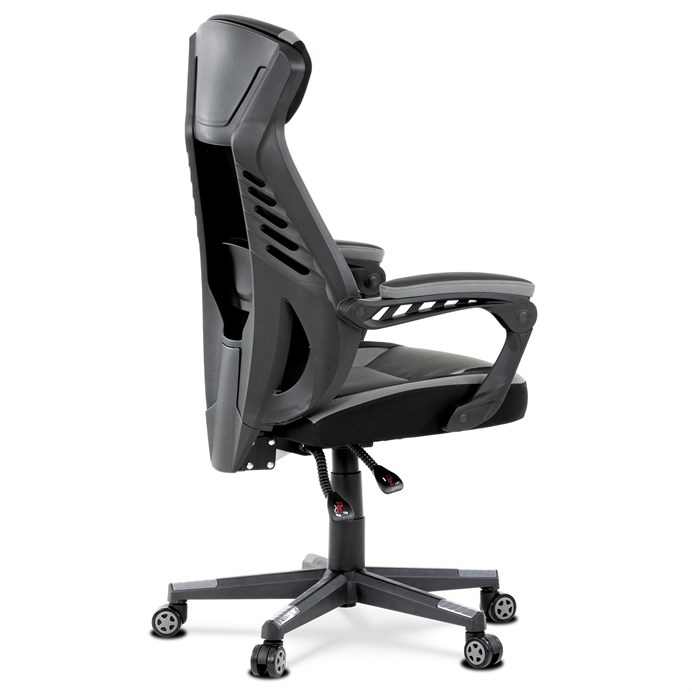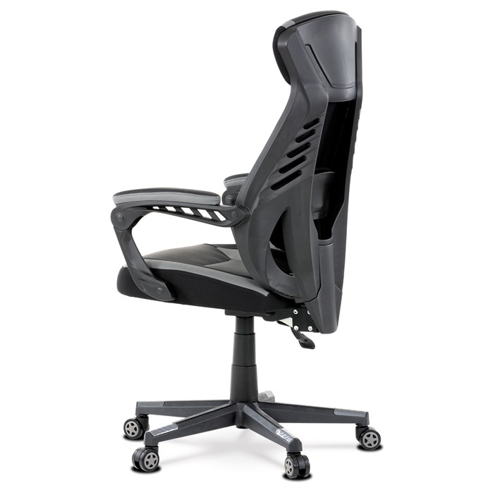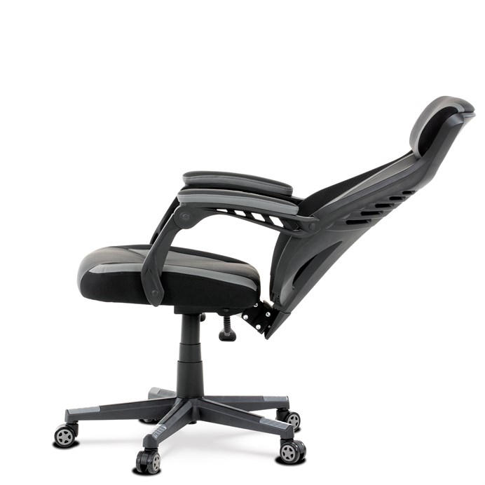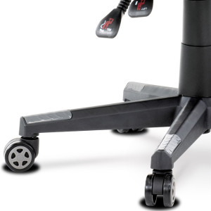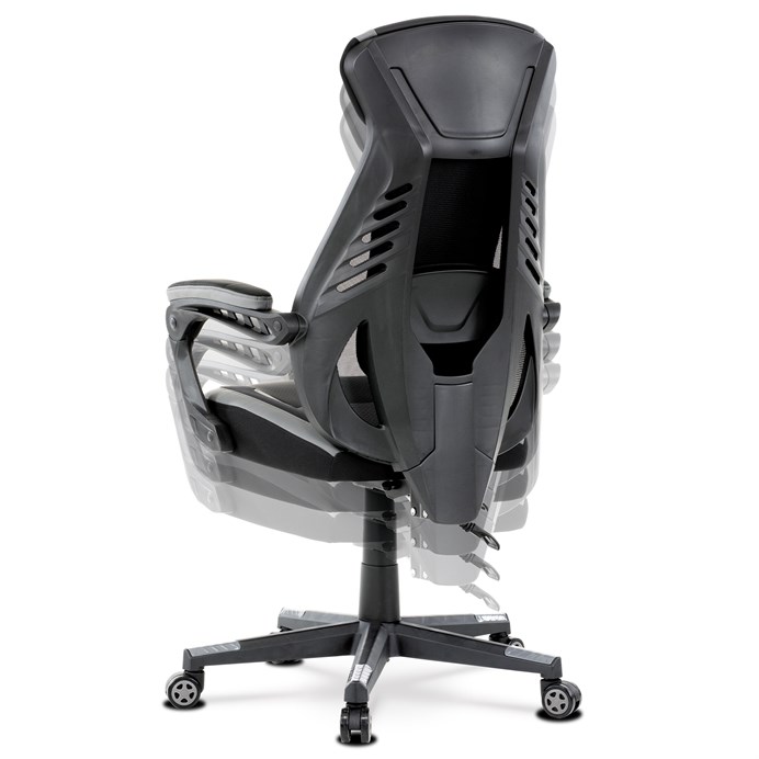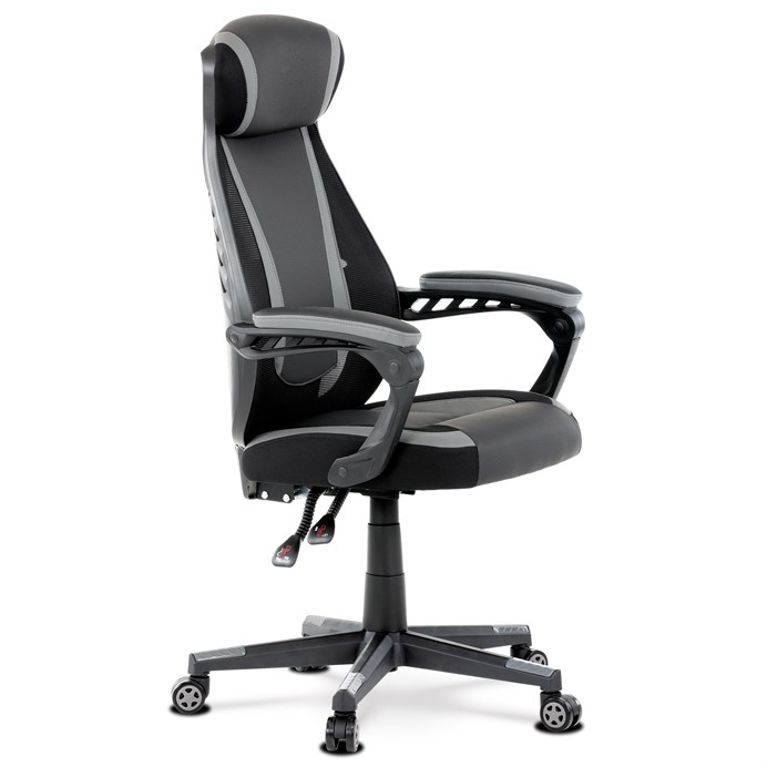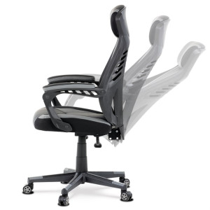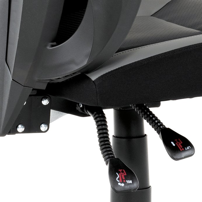 Křeslo je vybaveno houpacím mechanismem s plynulou aretací. Při vypnutí je možné se s opěradlem volně pohupovat. Výška sezení se upravuje jednou páčkou na pravé straně přes kvalitní plynový píst. Poloha opěráku se nastavuje druhou páčkou, umístěnou rovněž na pravé straně křesla. Masivní černý plastový kříž s šedýmii protiskluzovými plastovými doplňky je osazen černými plastovými kolečky pr. 6 cm s šedým racing středem a gumovým obvodem ideálními na tvrdé podlahy. Se stabilitou celých 70 cm průměru kříže si můžete dovolit i ty nejnáročnější hry.