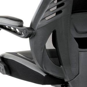 Vysoký, prodyšný a ergonomicky navržený opěrák s integrovanou zesílenou opěrkou hlavy, polstrovanou a výškově nastavitelnou bederní opěrkou slouží nejen jako výborná opora celých zad a také podporuje správné držení páteře. Područky jsou plastové, polstrované a potažené modrou a černou ekokůží. Šíře je 7 cm, délka ložné plochy 33 cm a výška 3 cm. Při sklápění sedáku se pohybují a kopírují jeho pohyb a polohu. Nosnost židle je až 130 kg.